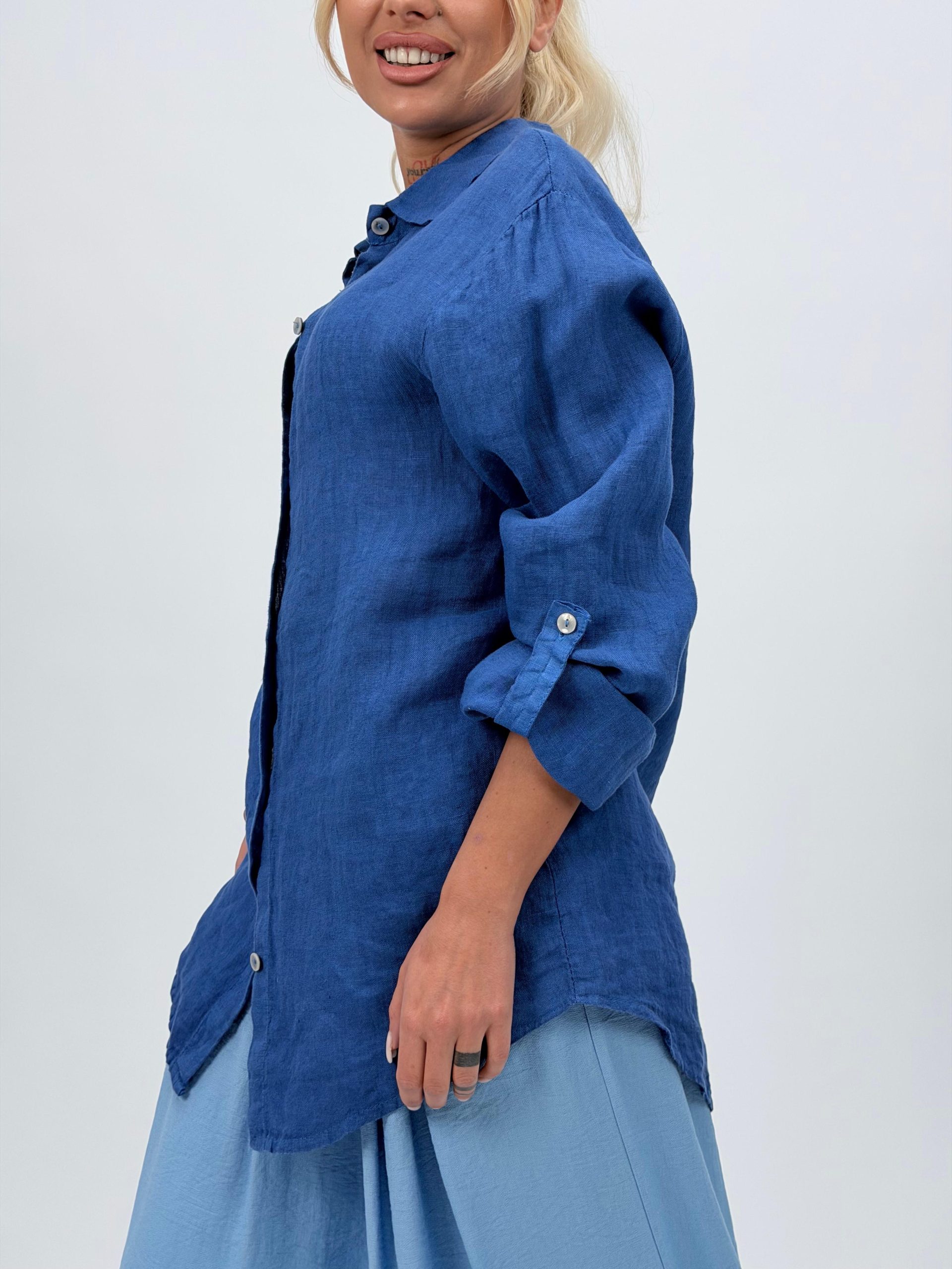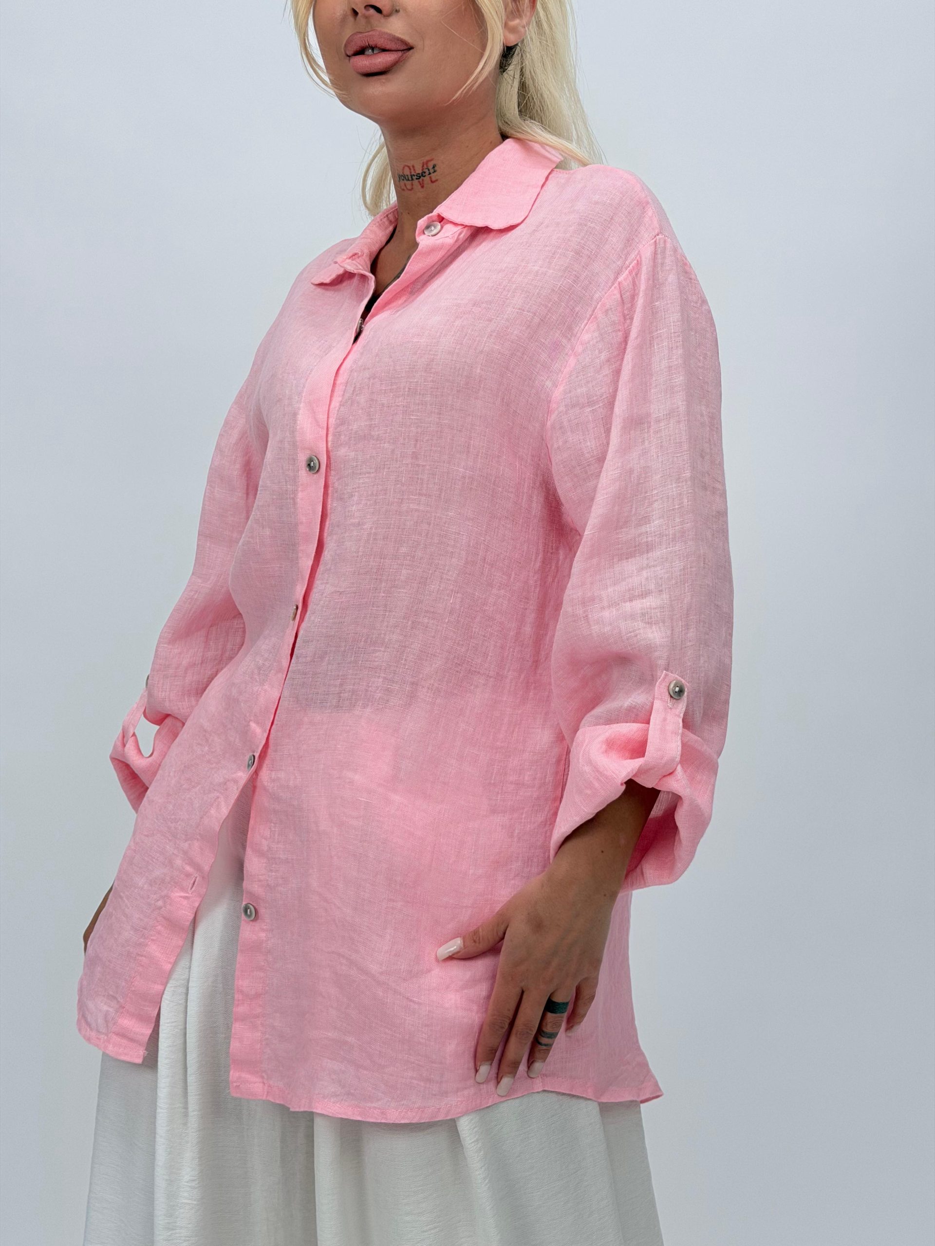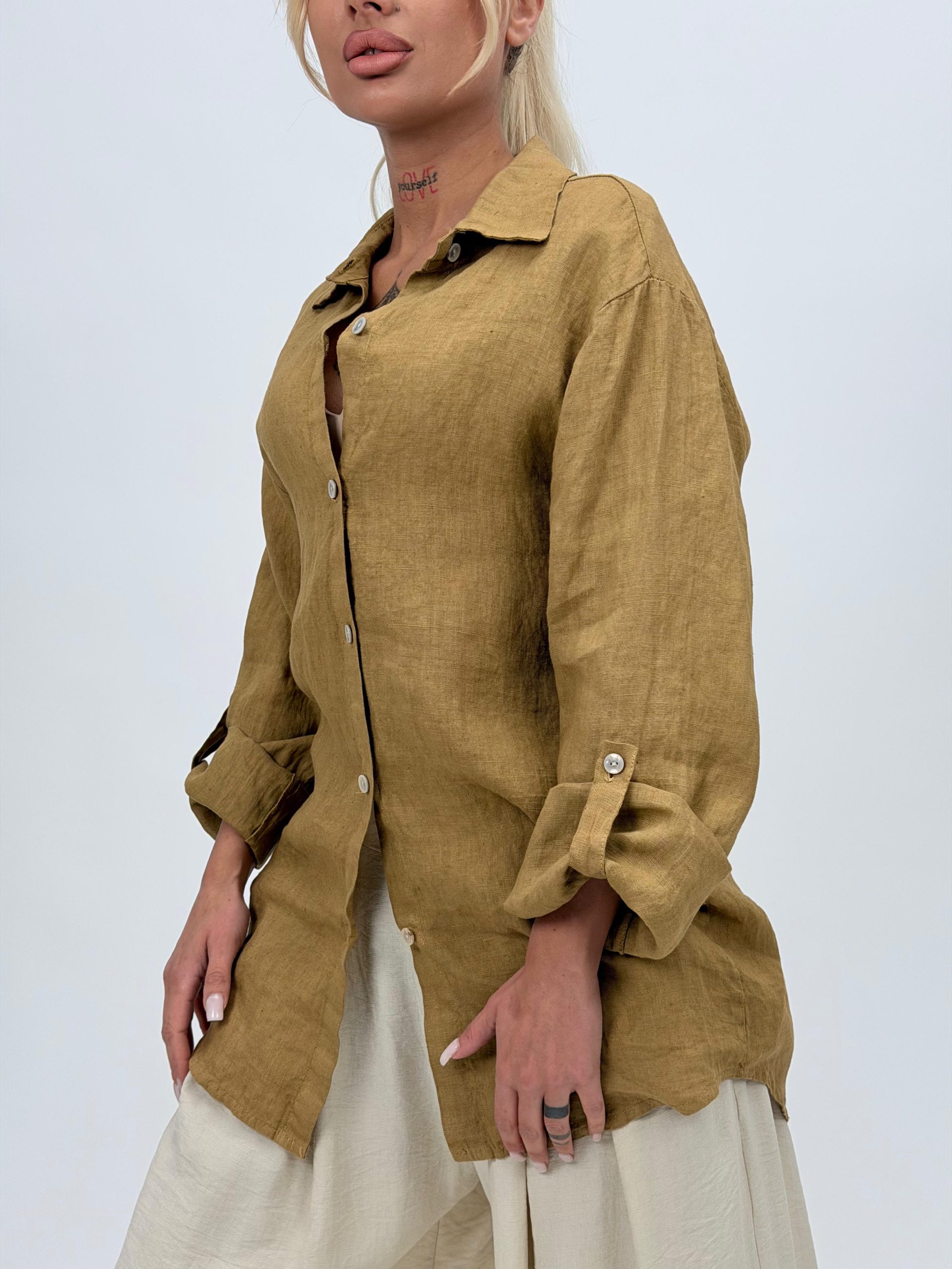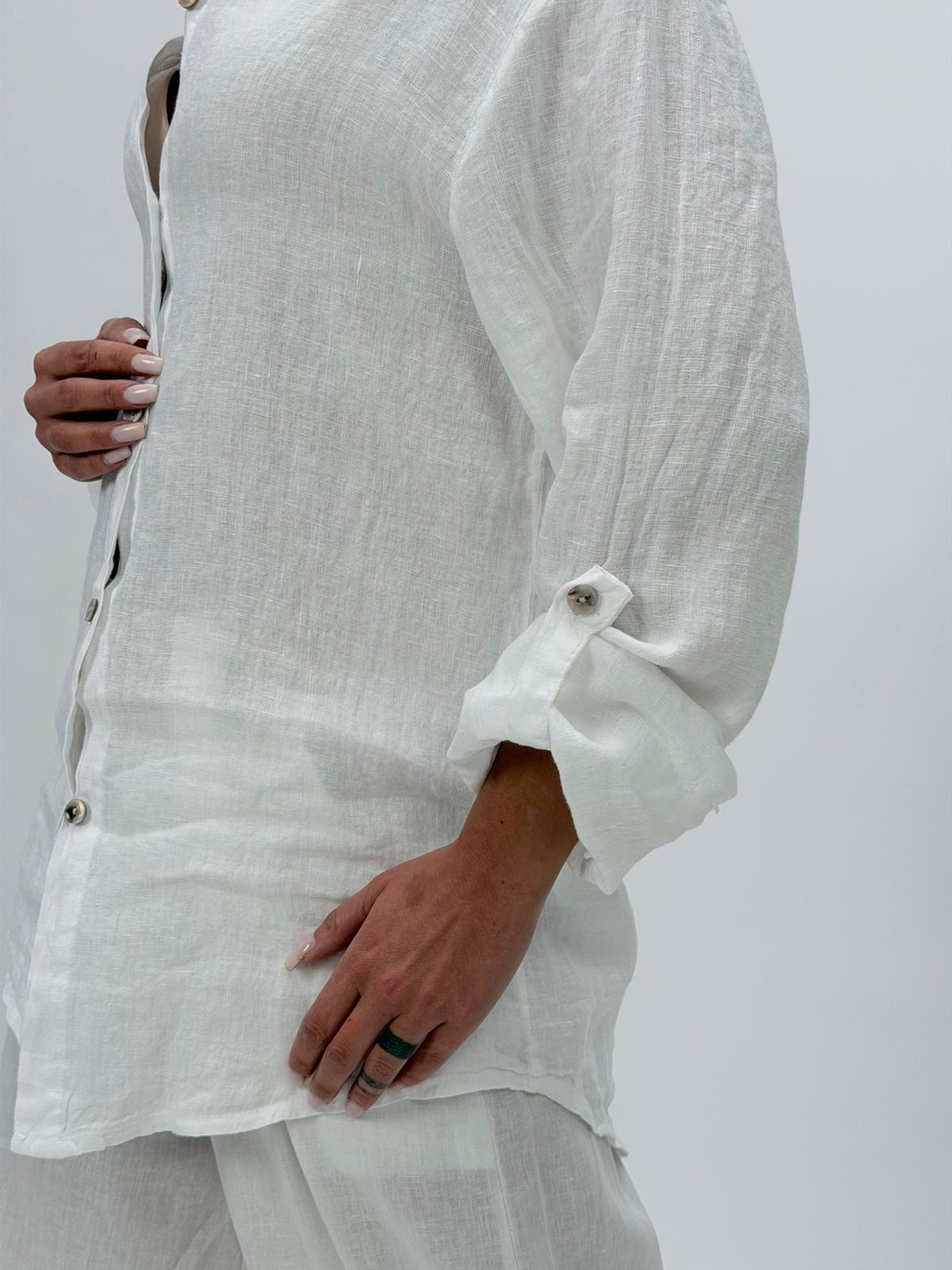 Fabricată din in natural, această cămașă este perfectă pentru zilele călduroase de vară. Inul este cunoscut pentru proprietățile sale excelente de respirabilitate și capacitatea de a absorbi umiditatea, păstrându-te mereu confortabilă și răcoroasă.