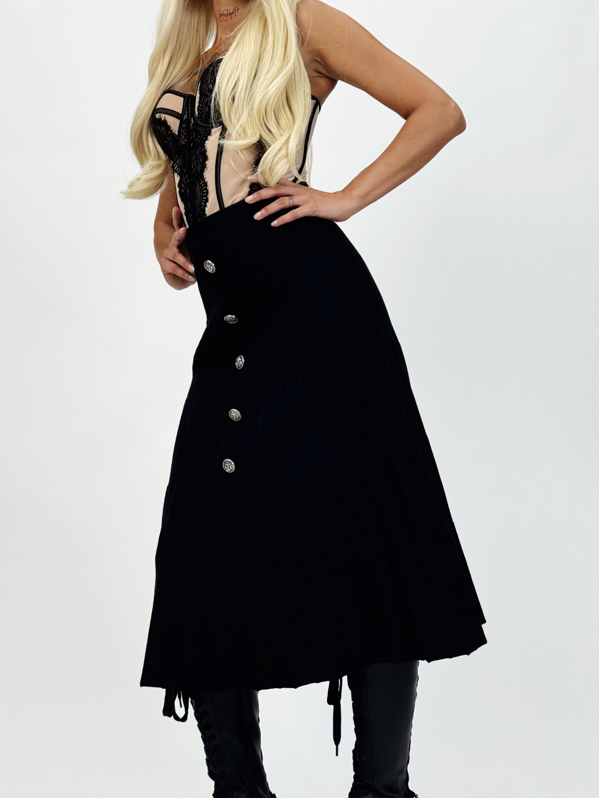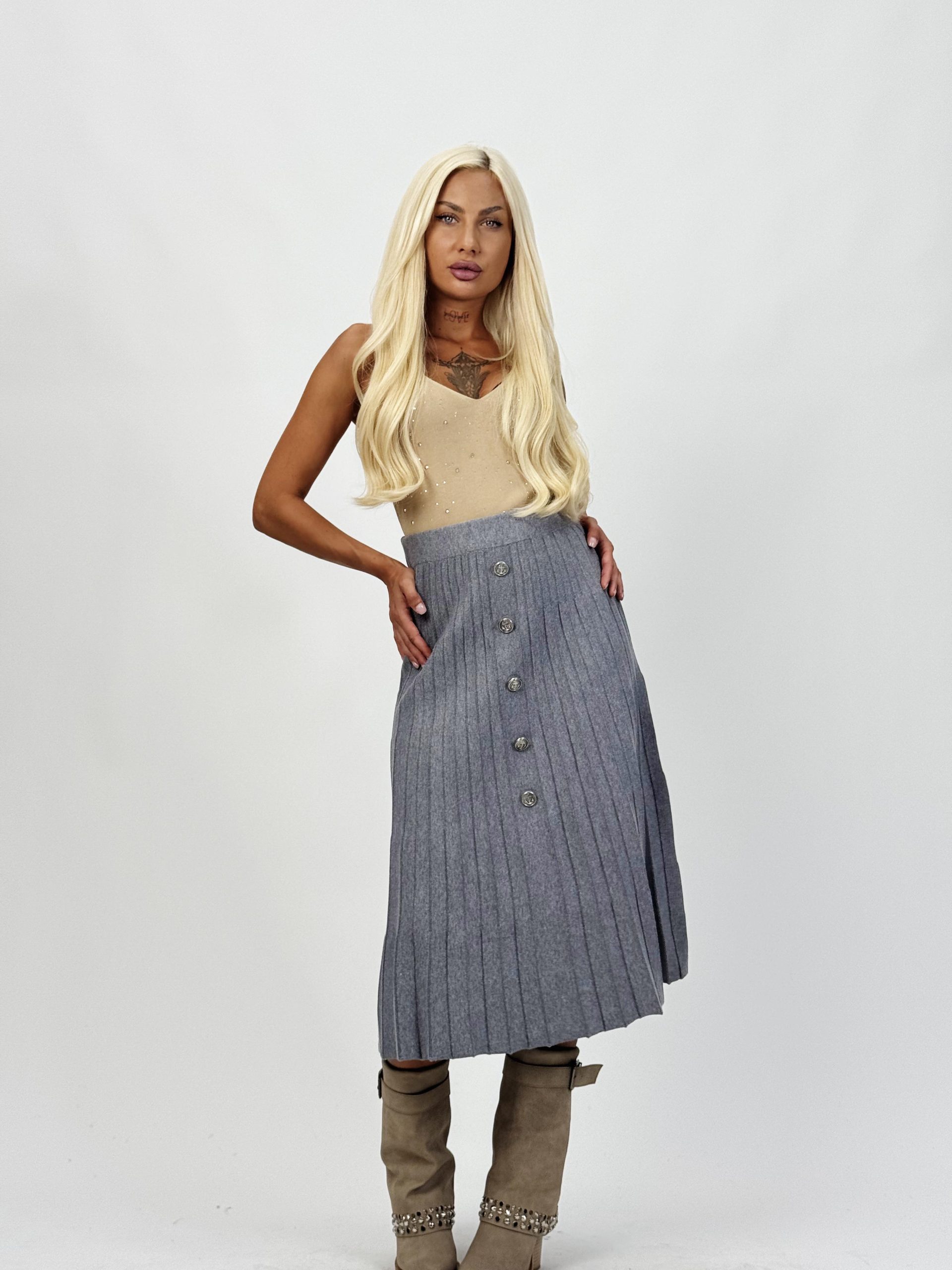 Fustă lungă plisată din jerse cu butoni aurii – Eleganță și confort într-o singură piesă