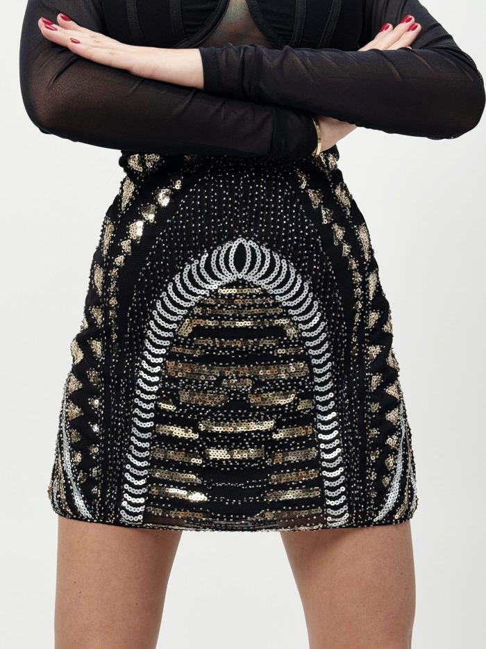 Fustă scurtă cu model din paiete – eleganță și strălucire într-o piesă statement
