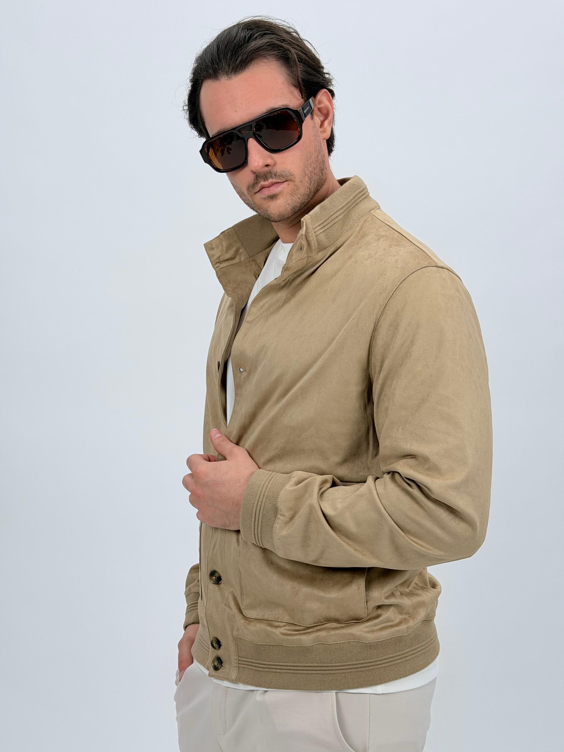 Jachetă cu guler tunică și aspect de piele întoarsă