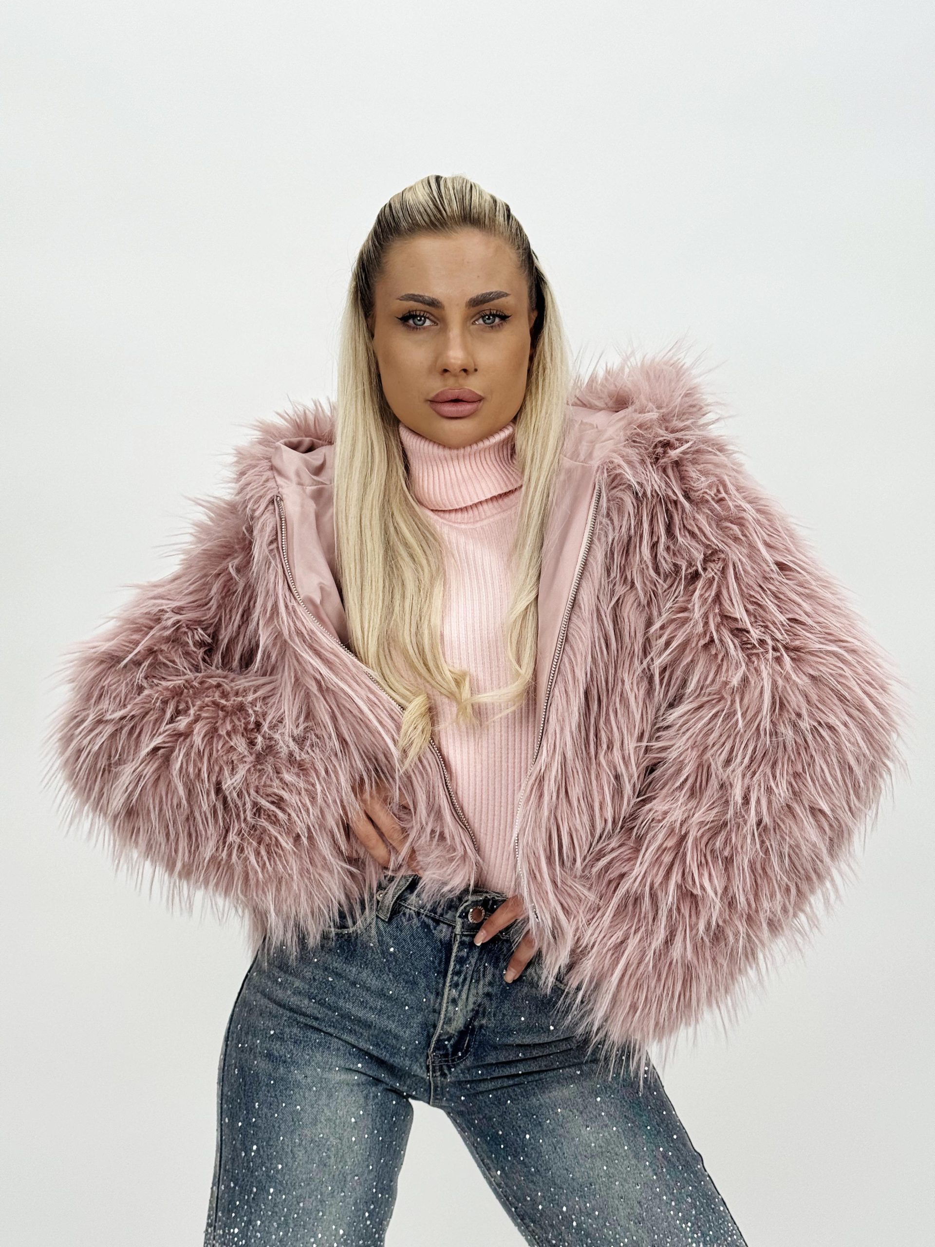 Jacheta din blană cu glugă este piesa perfectă pentru zilele reci, oferind echilibrul ideal între confort, eleganță și funcționalitate. Blana moale și plăcută la atingere te învăluie într-o senzație de căldură și rafinament, în timp ce gluga adaugă un plus de protecție și un aer modern. Versatilă și stilată, această jachetă este ideală pentru ținutele casual, urbane sau elegante de iarnă.