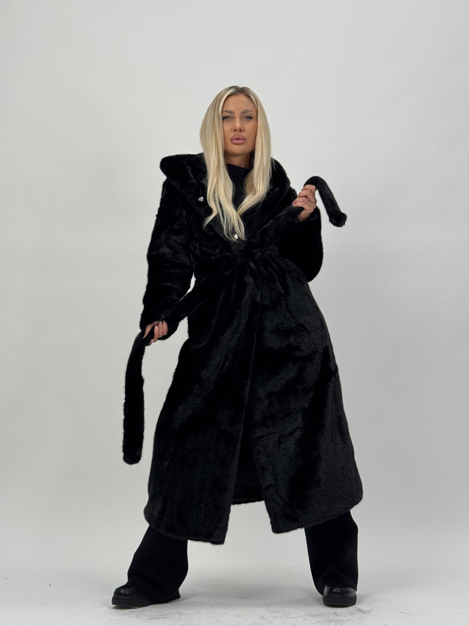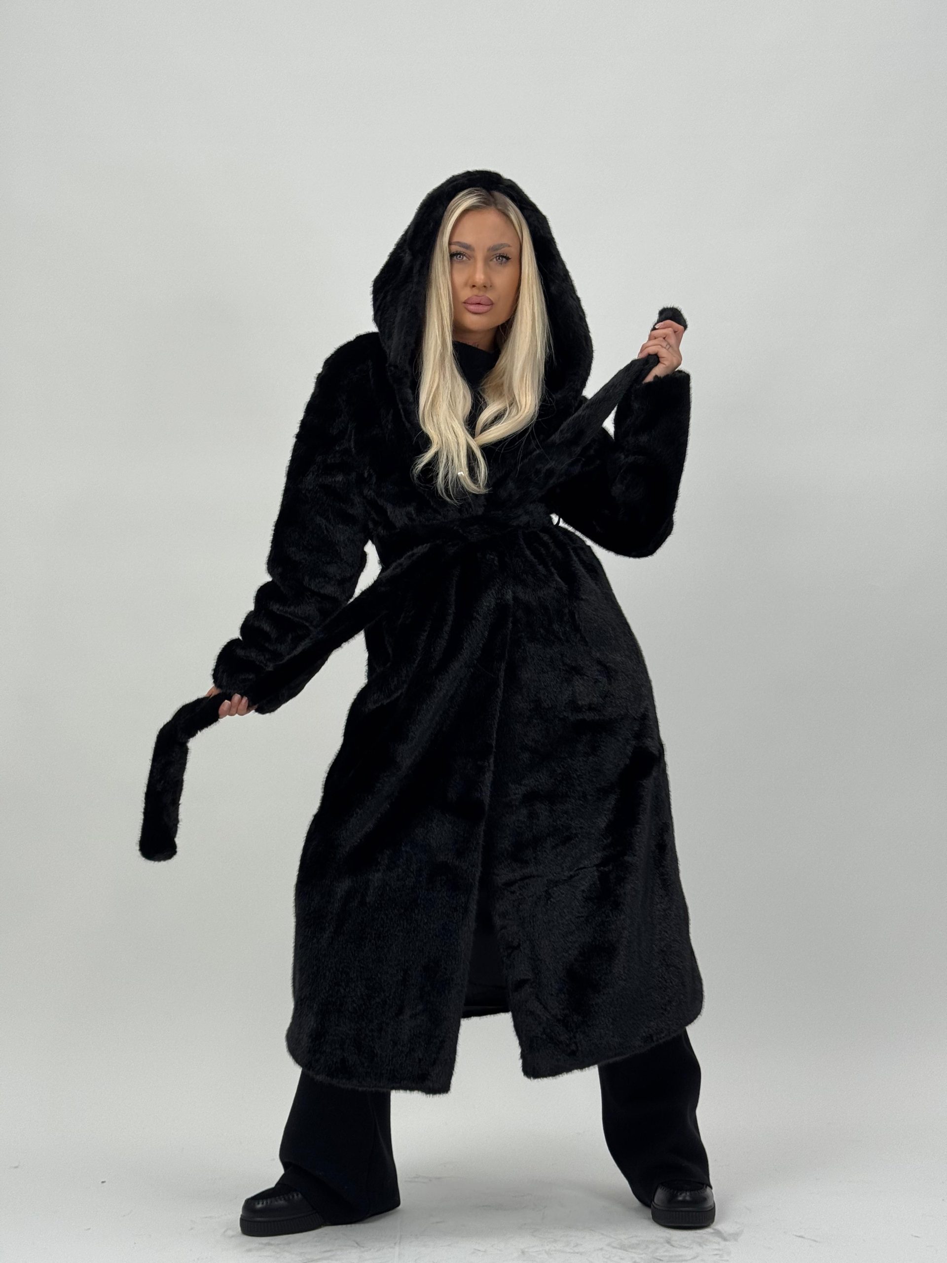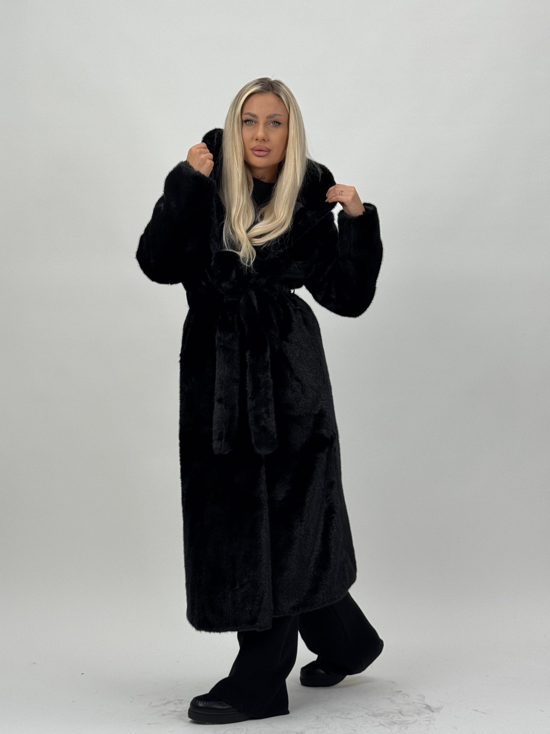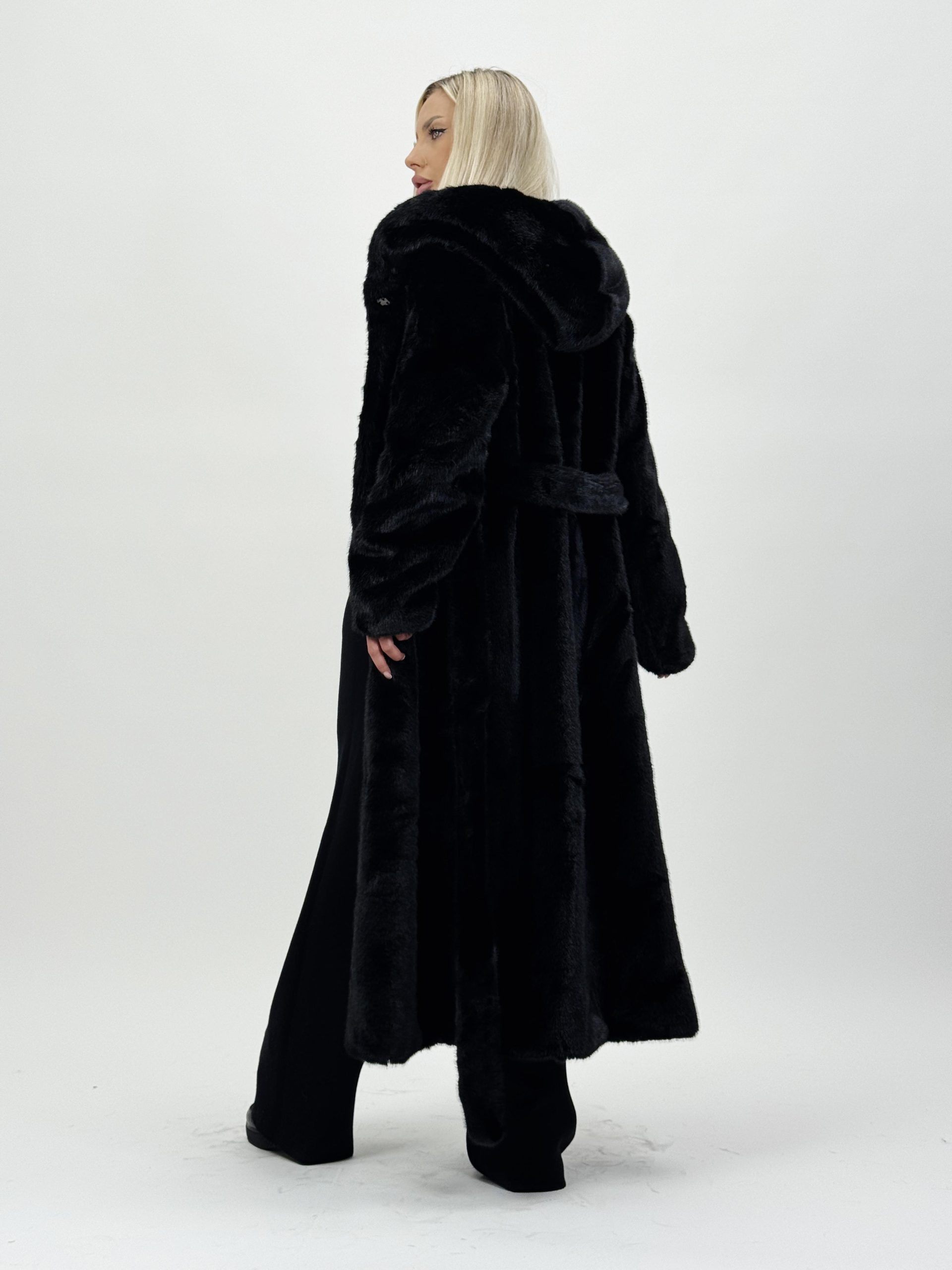 Jachetă lungă din blană cu glugă