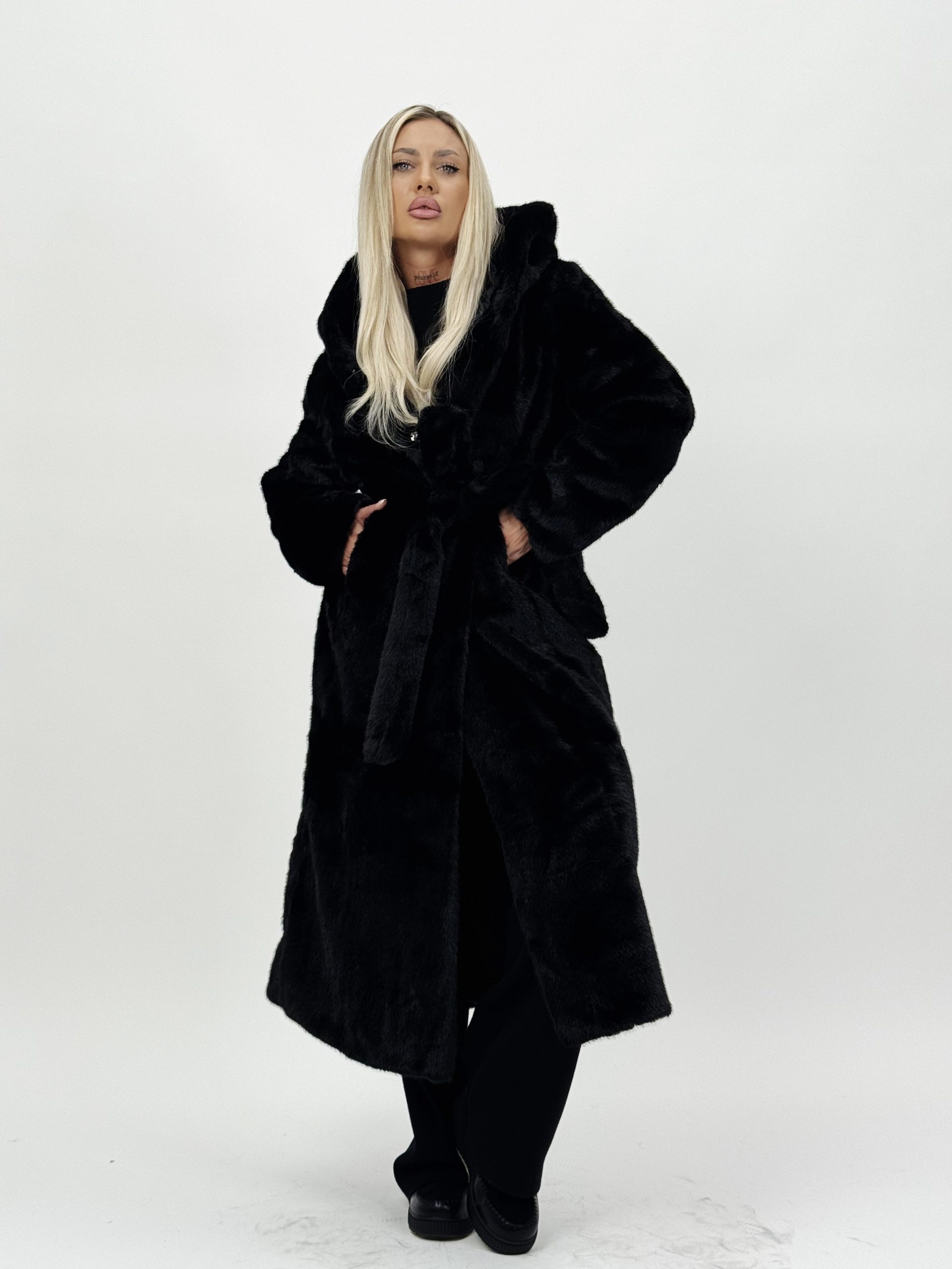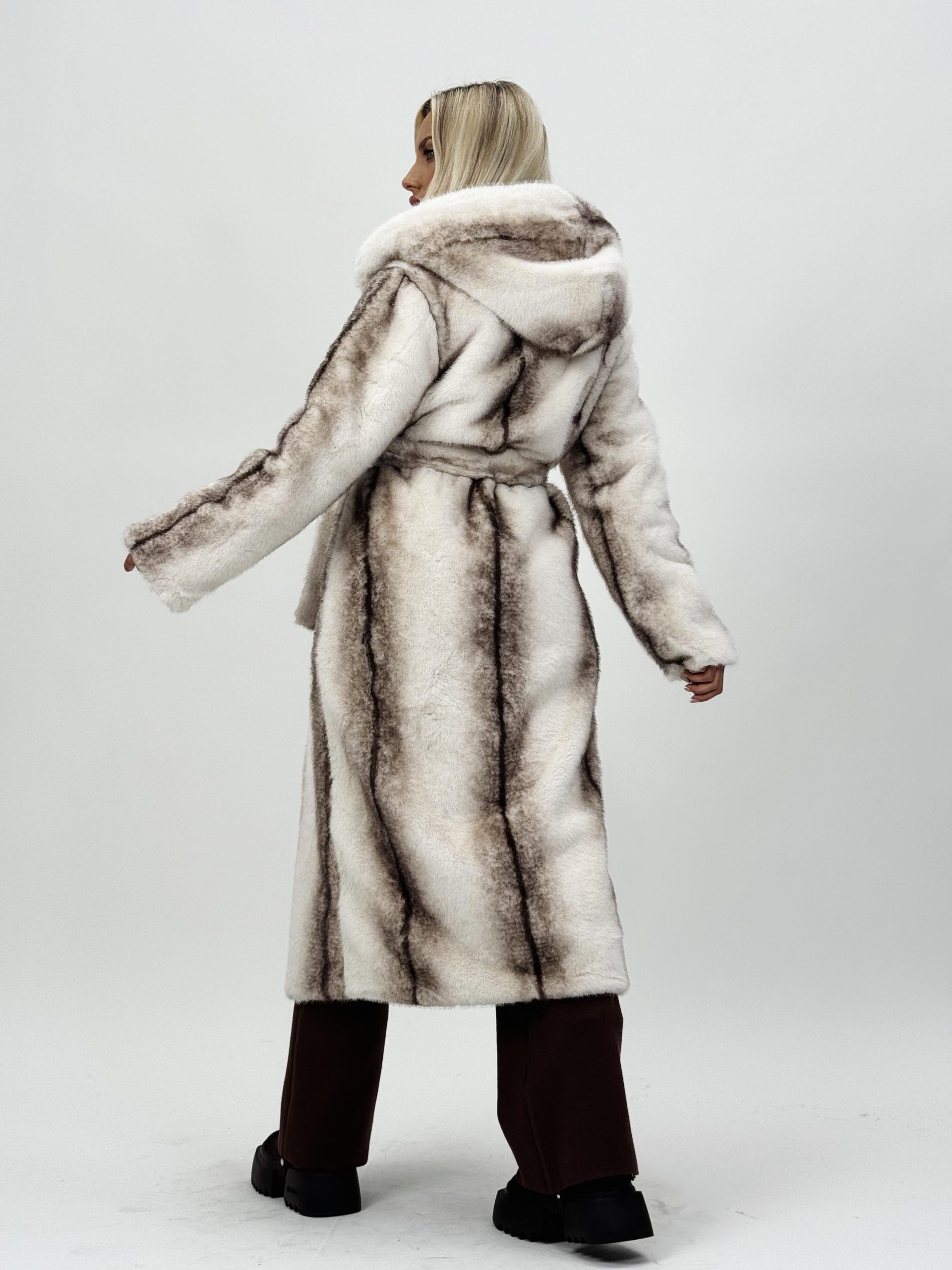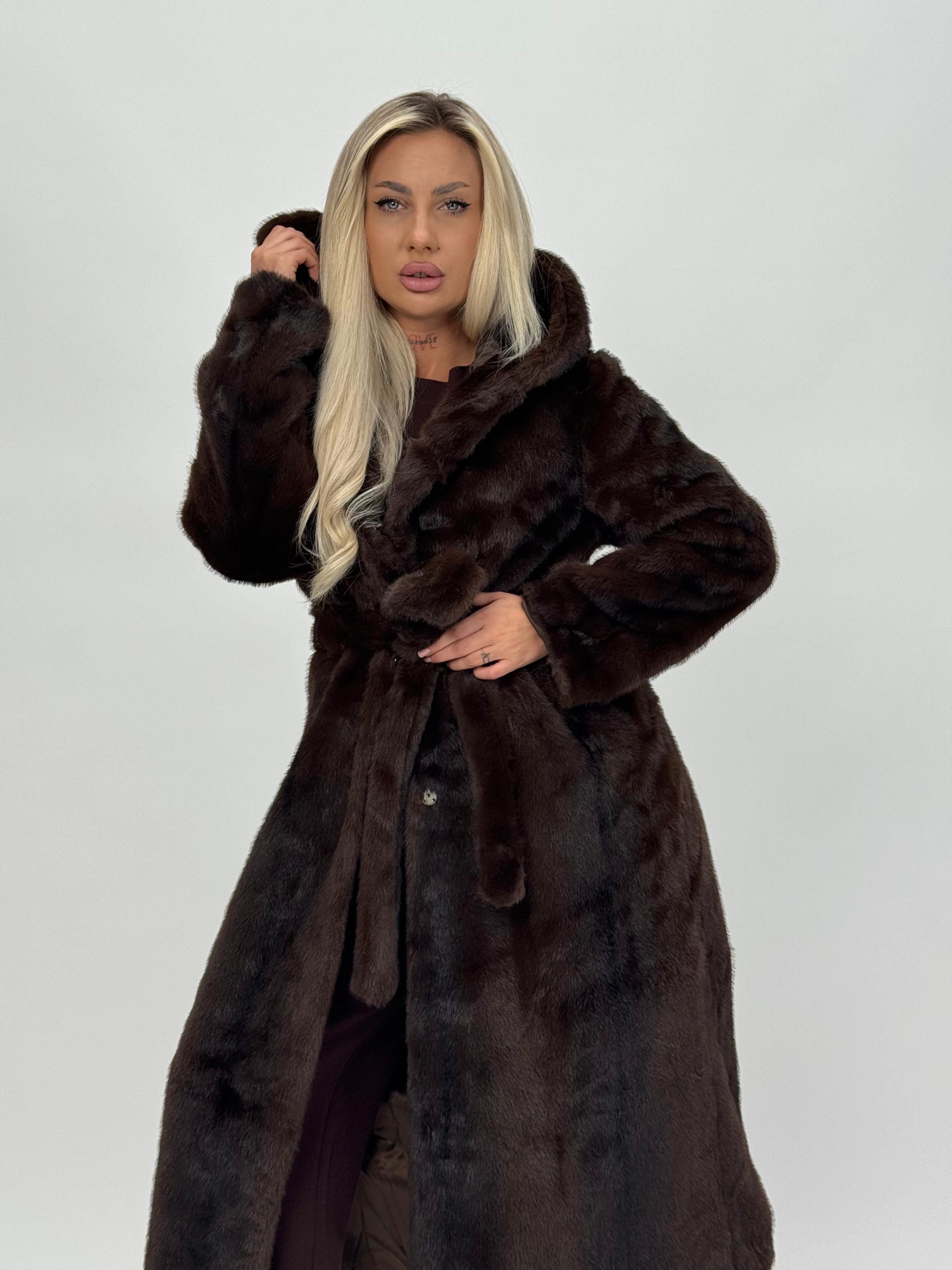 Jachetă lungă din blană cu glugă