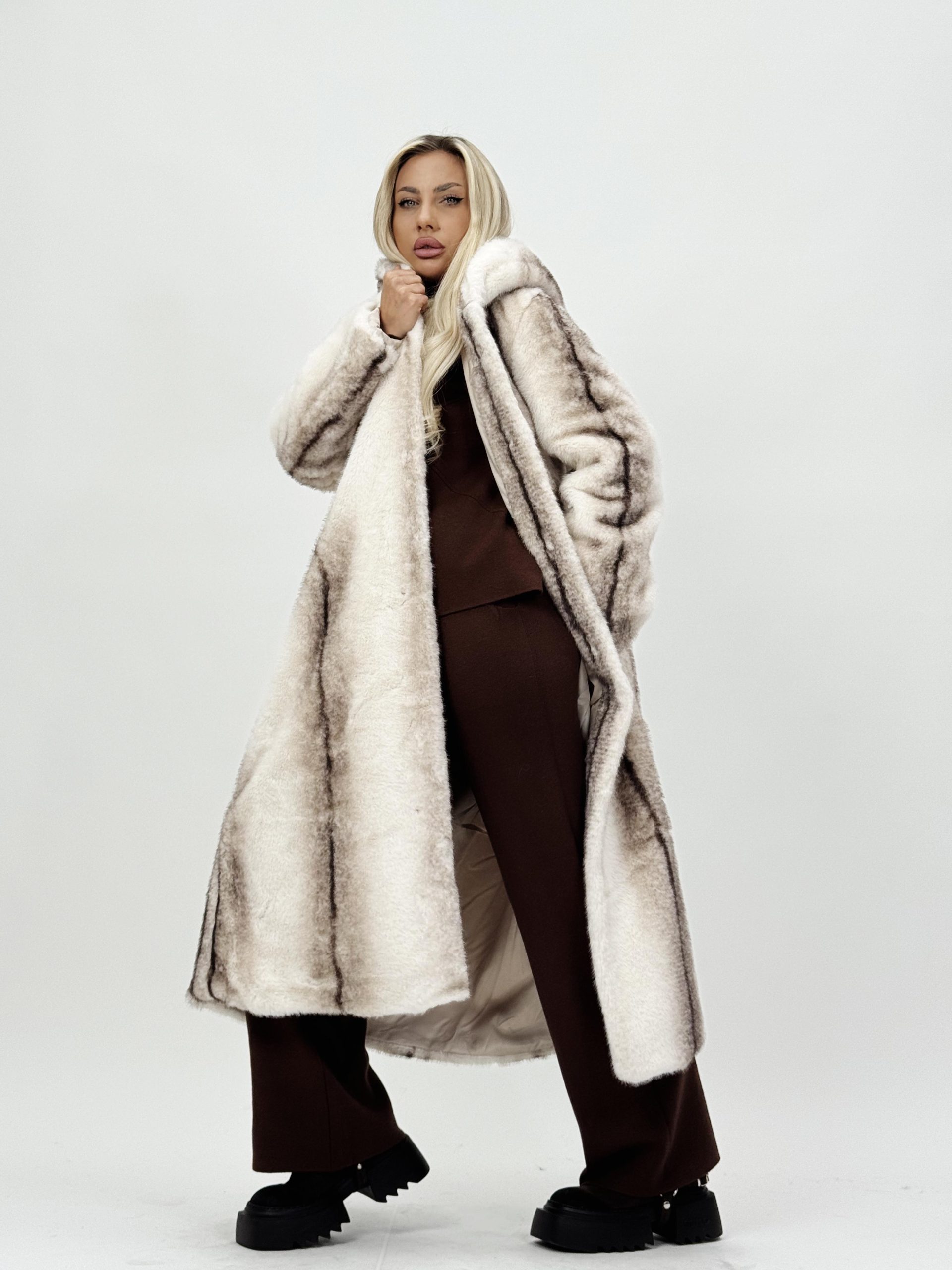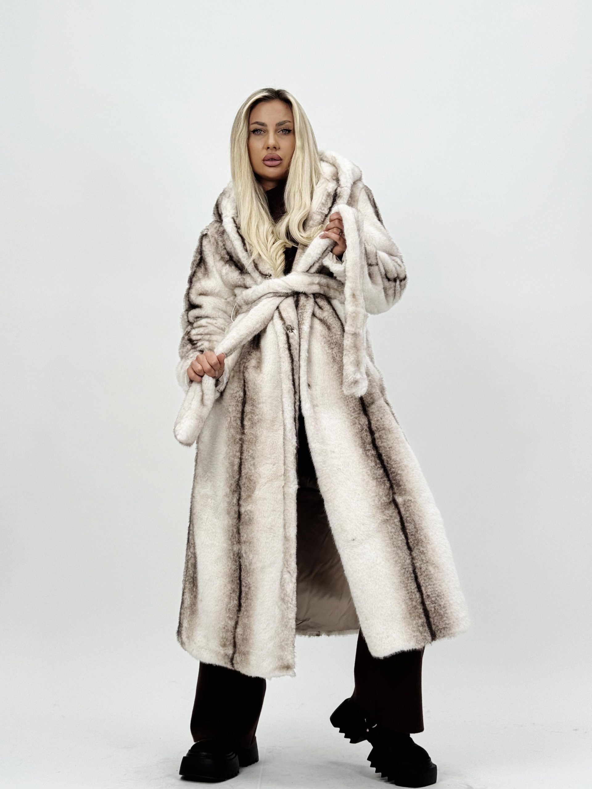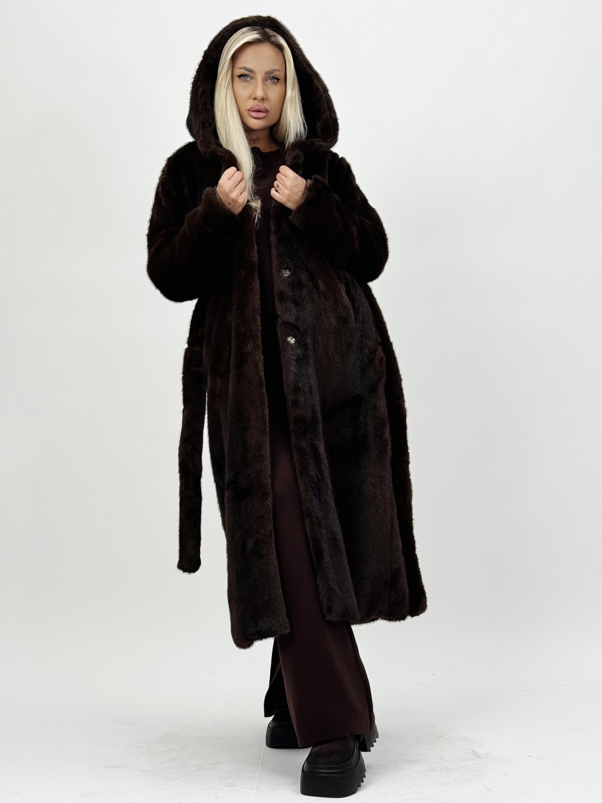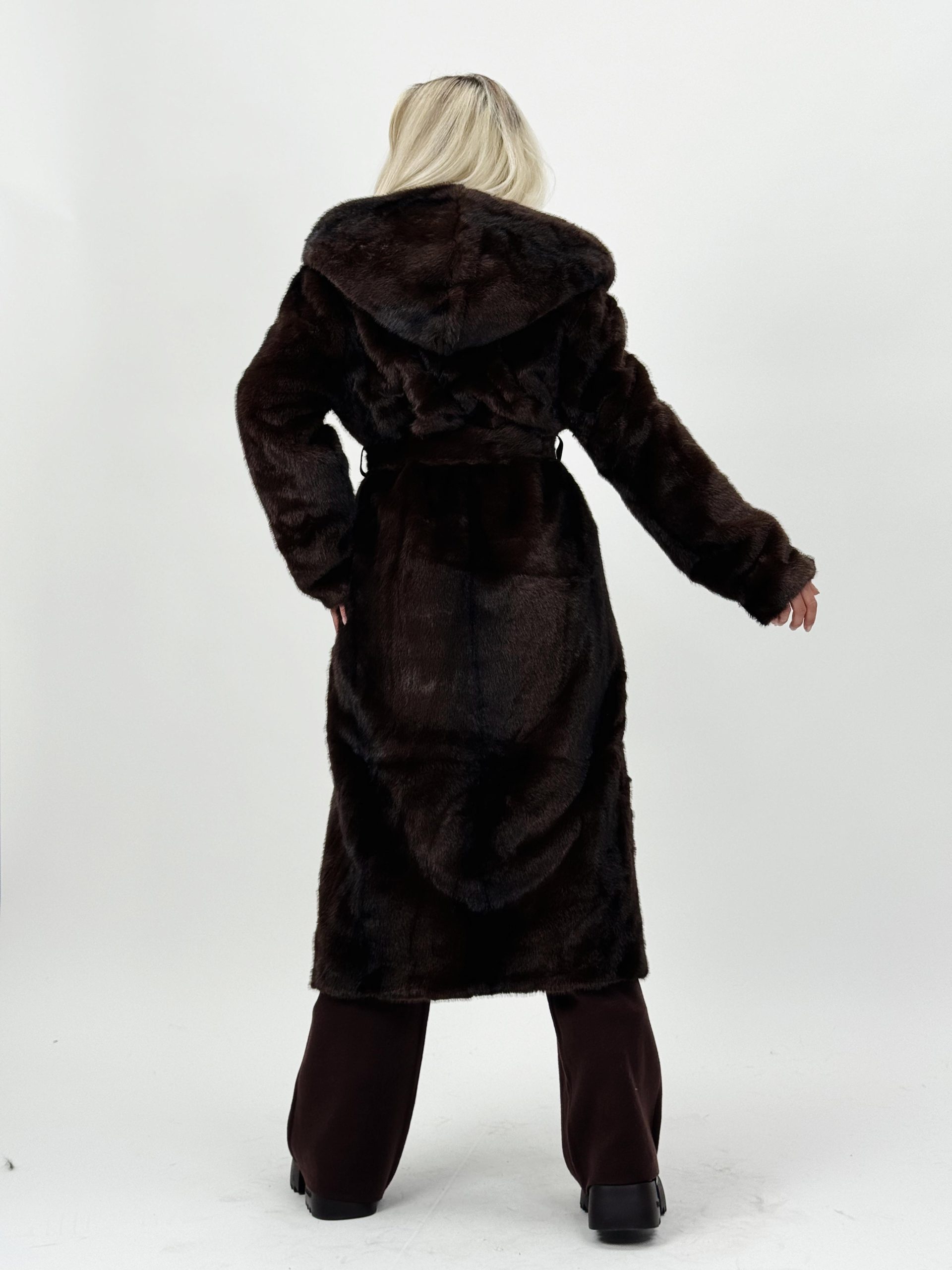 Jachetă lungă din blană cu glugă