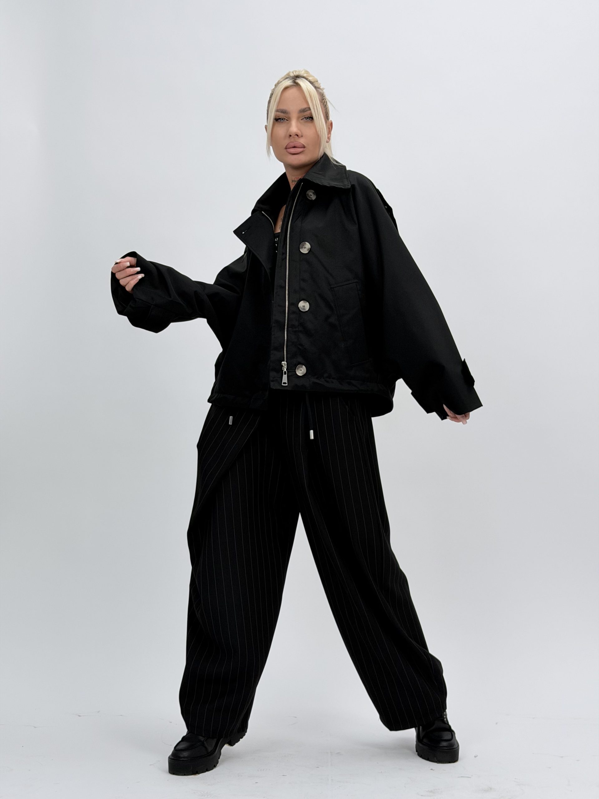 Jacheta oversized este perfectă pentru un look lejer, dar bine definit.
