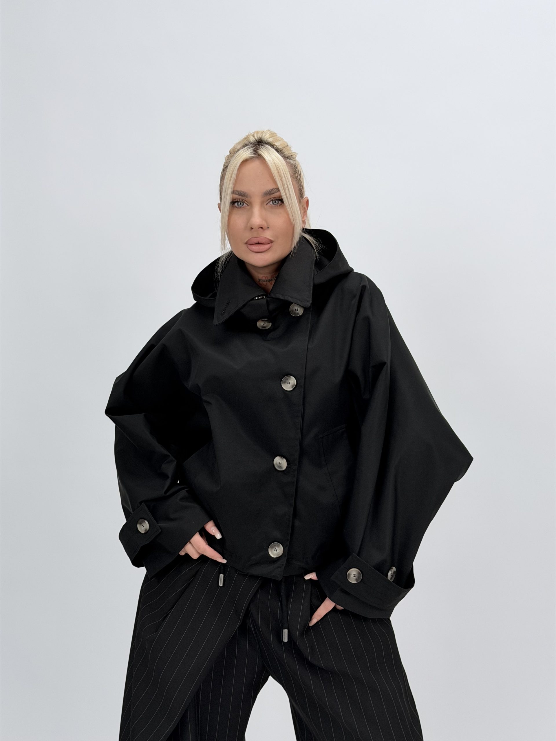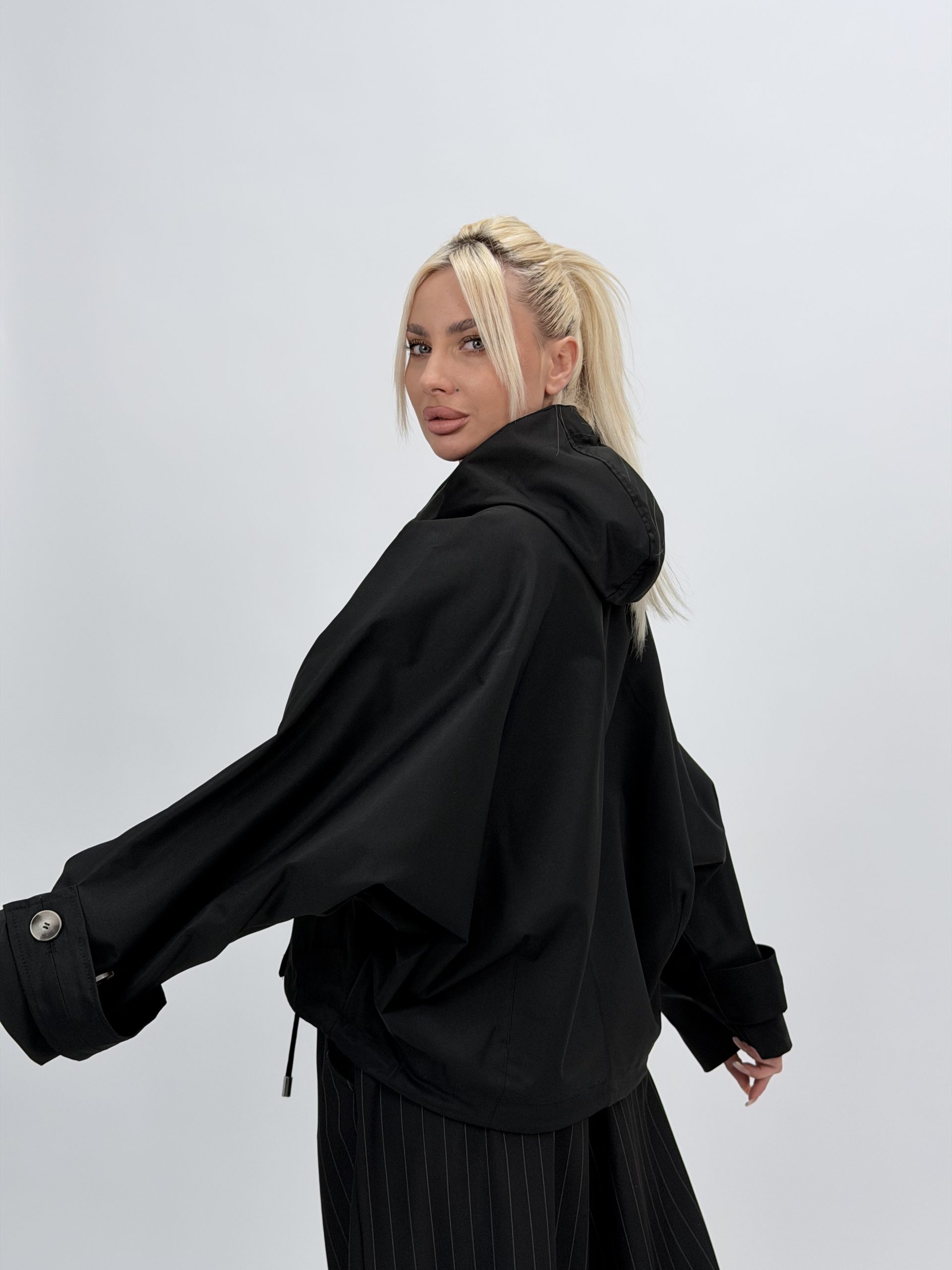 Jachetă din fâș oversized cu glugă detașabilă – design modern și funcțional