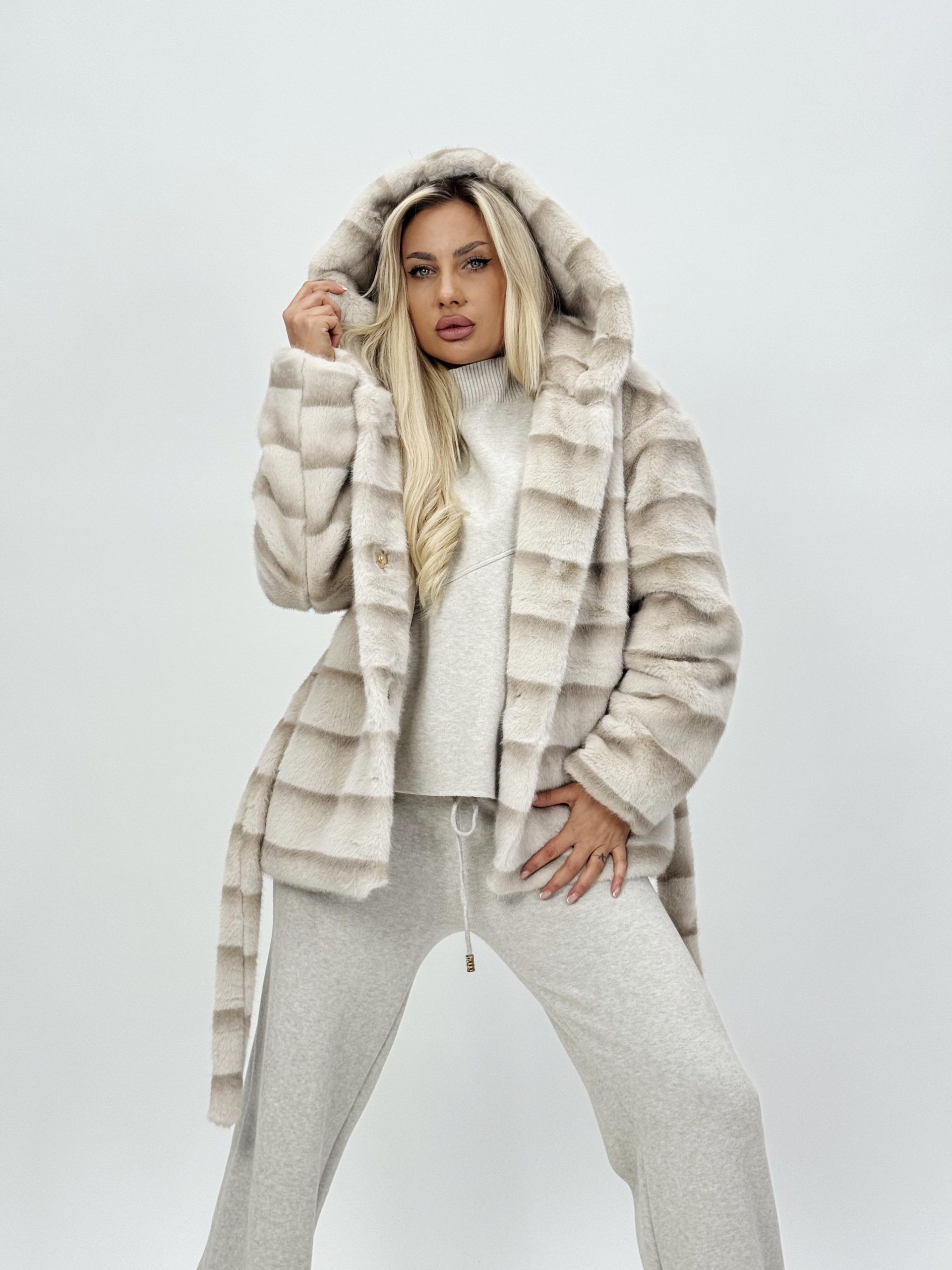 Jacheta scurtă din blană cu glugă și cordon este piesa ideală pentru sezonul rece, combinând confortul termic cu un design modern și practic. Croiala scurtă subliniază talia datorită cordonului ajustabil, în timp ce gluga oferă protecție suplimentară împotriva vântului și frigului. Materialul moale și călduros, împreună cu textura luxurioasă a blănii, conferă un look elegant, potrivit pentru ținute casual, urbane sau office.