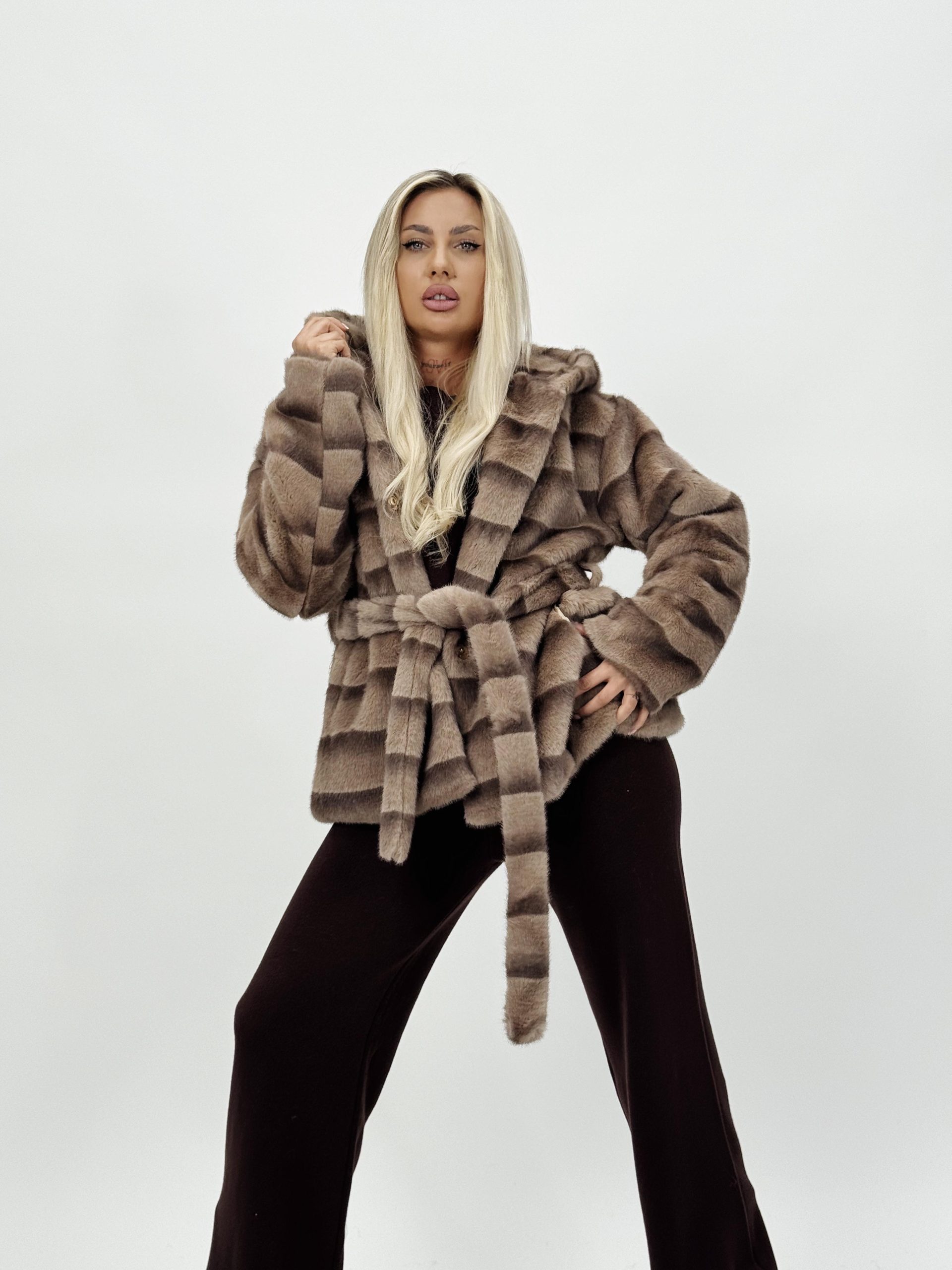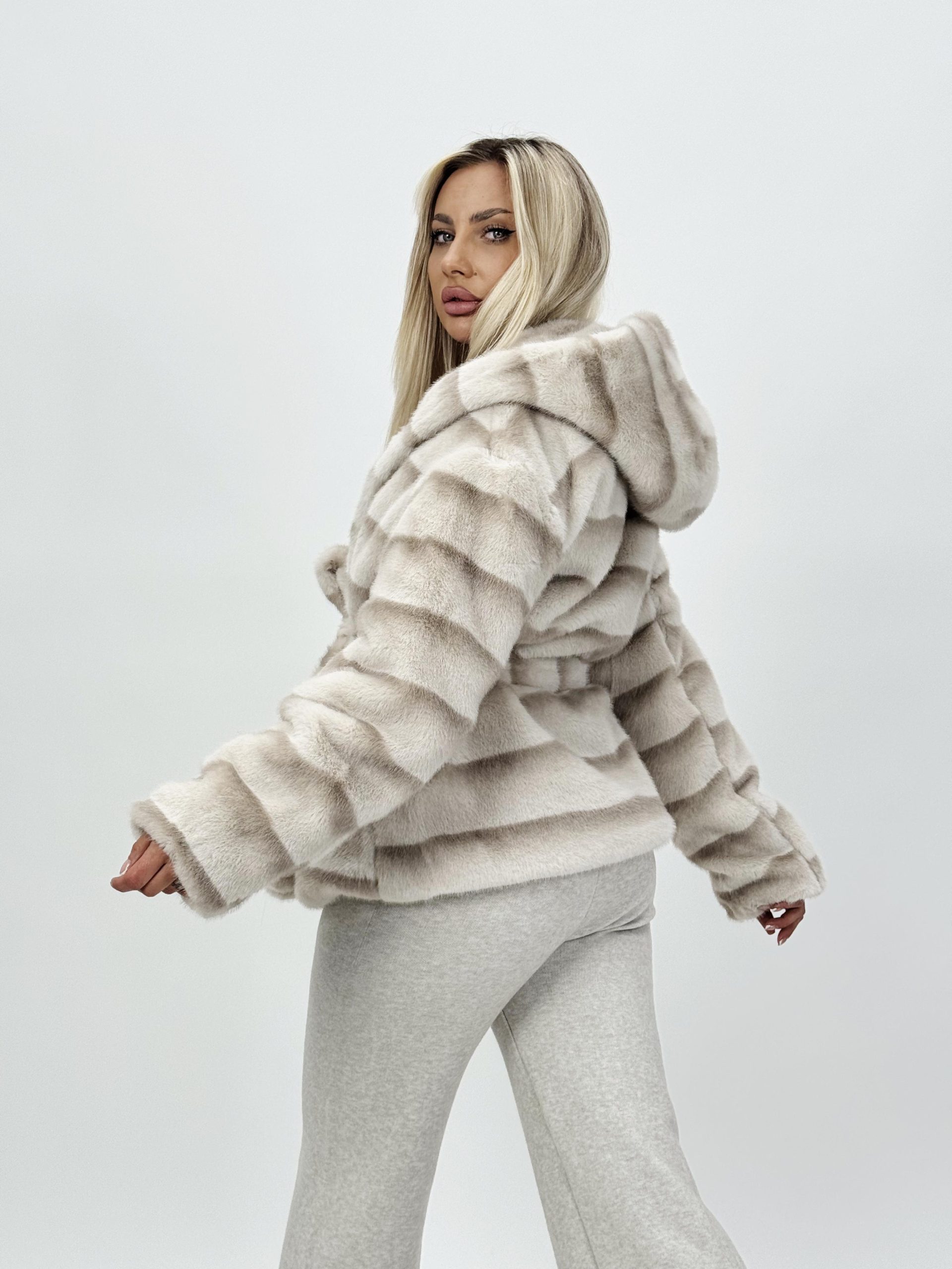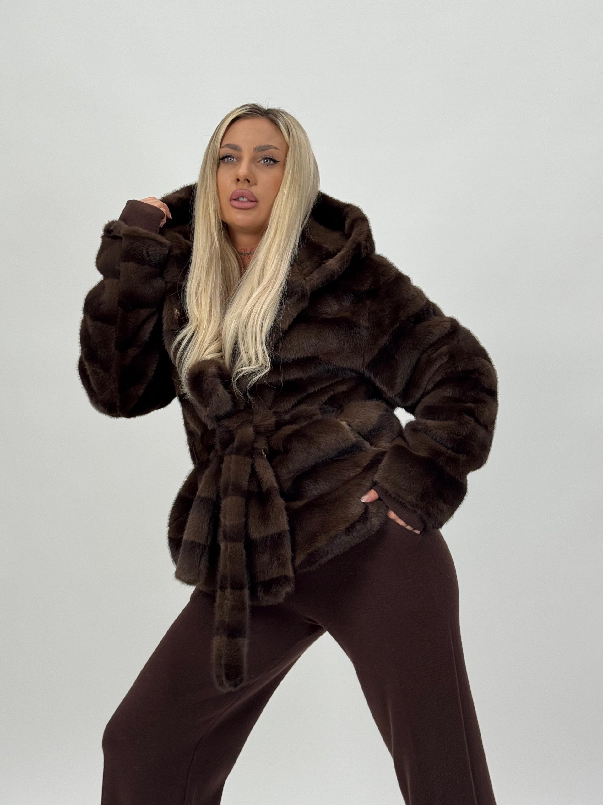 Jachetă Scurtă din Blană cu Glugă și Cordon – Eleganță și Funcționalitate