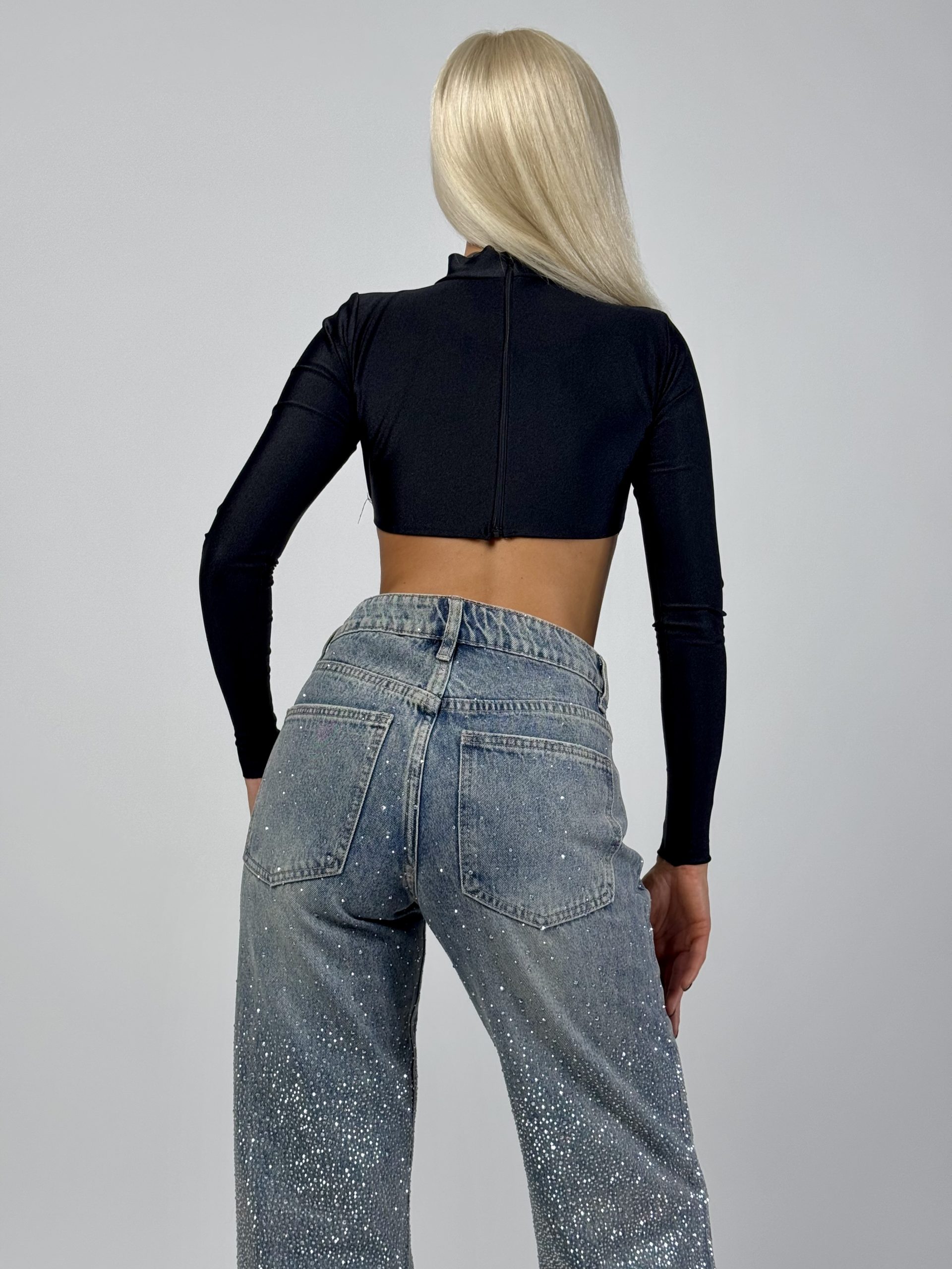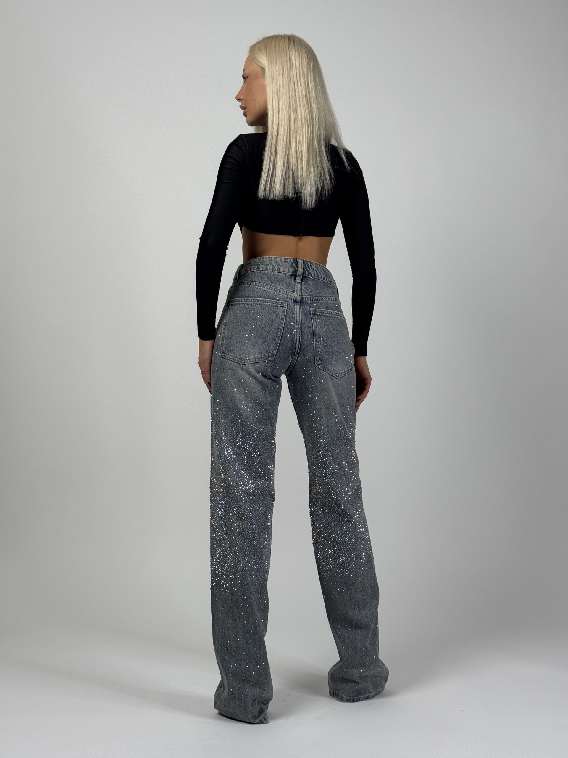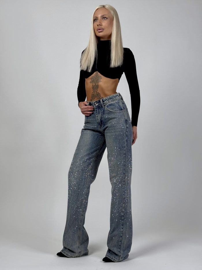 Jeans Albastru Wide Leg cu ștrasuri – Strălucire și Eleganță