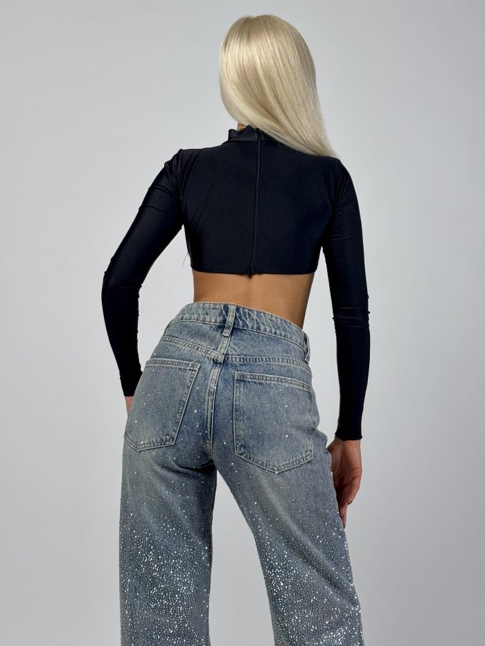 Acest model de jeans albastru wide leg cu ștrasuri se remarcă prin detaliile de lux: ștrasurile strălucitoare aplicate strategic pe toată suprafața jeansului. Aceste elemente adaugă un aer sofisticat și elegant outfitului tău, fără să compromită confortul și versatilitatea pe care o oferă denimul clasic.