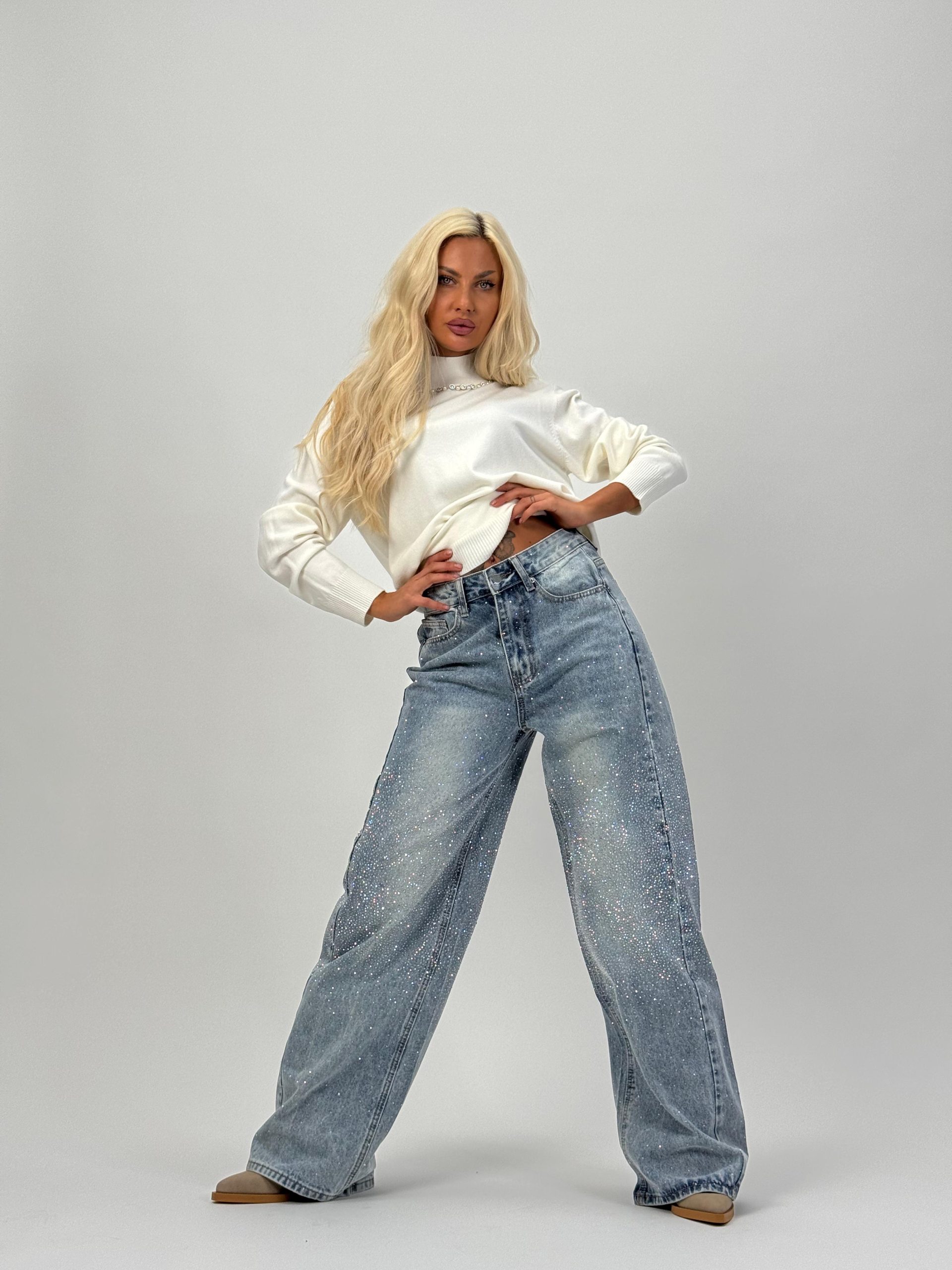 Cum să porți acest Jeans | Blug Wide Leg Albastru cu Ștrasuri și Talie Înaltă
