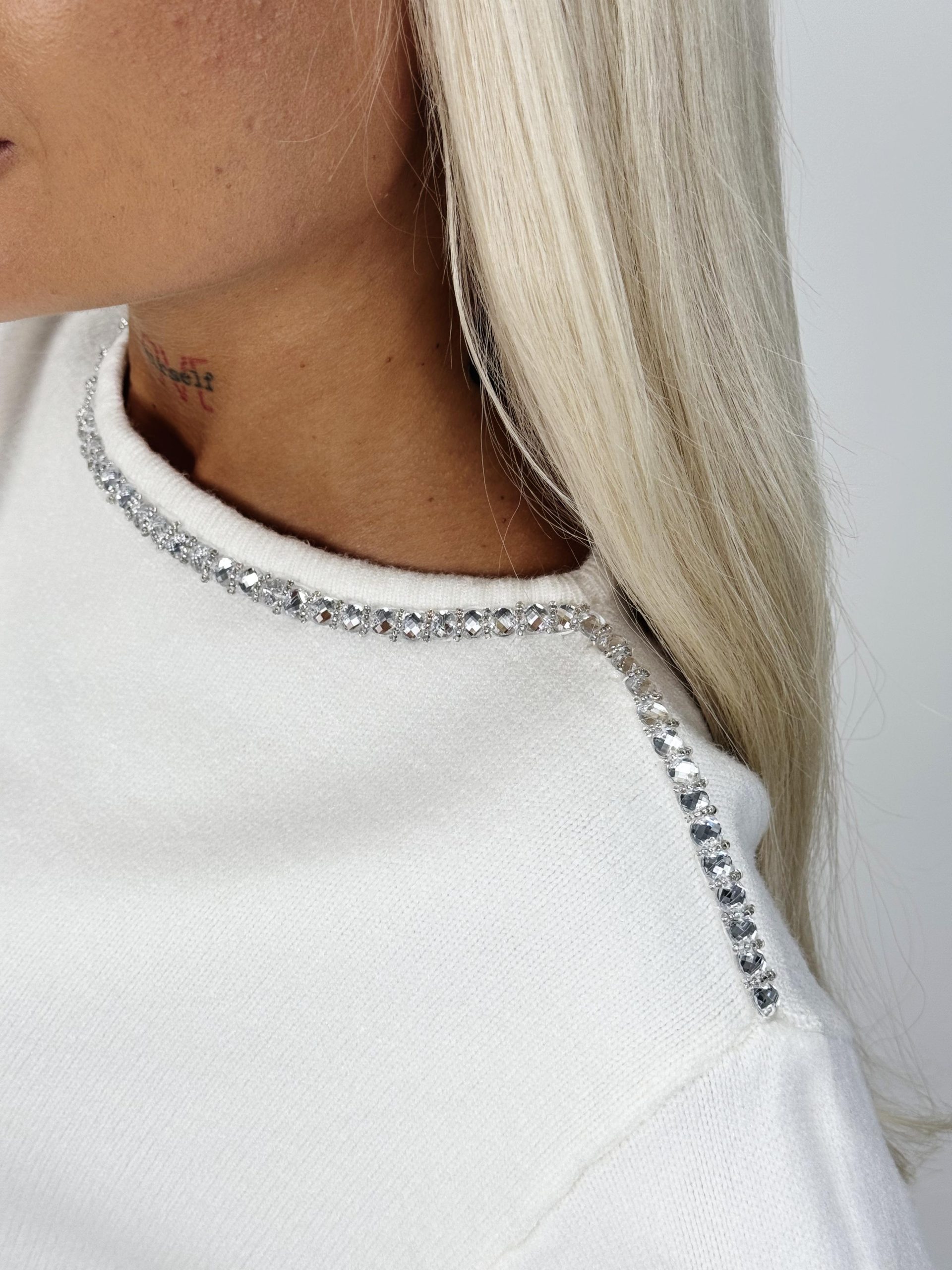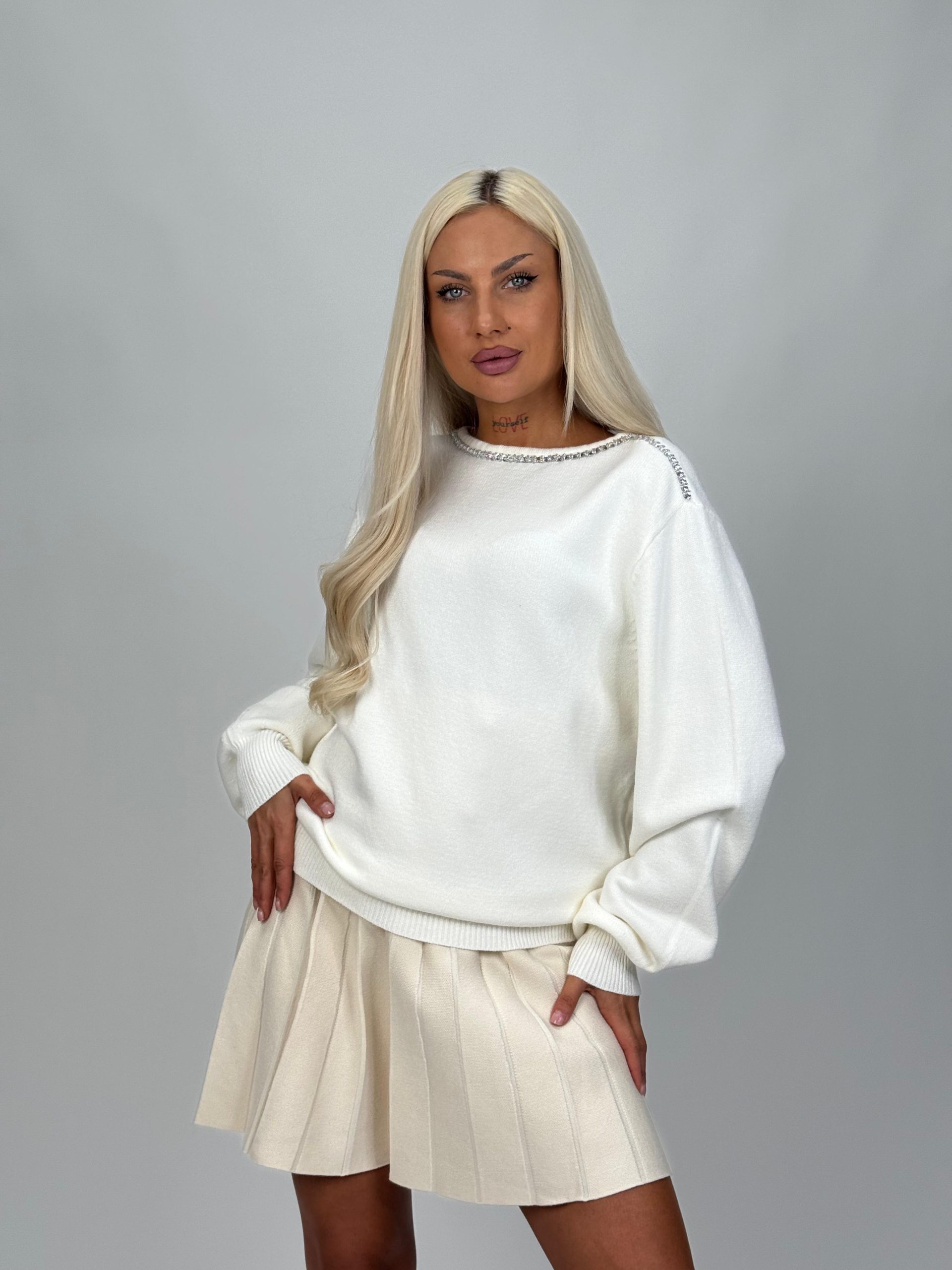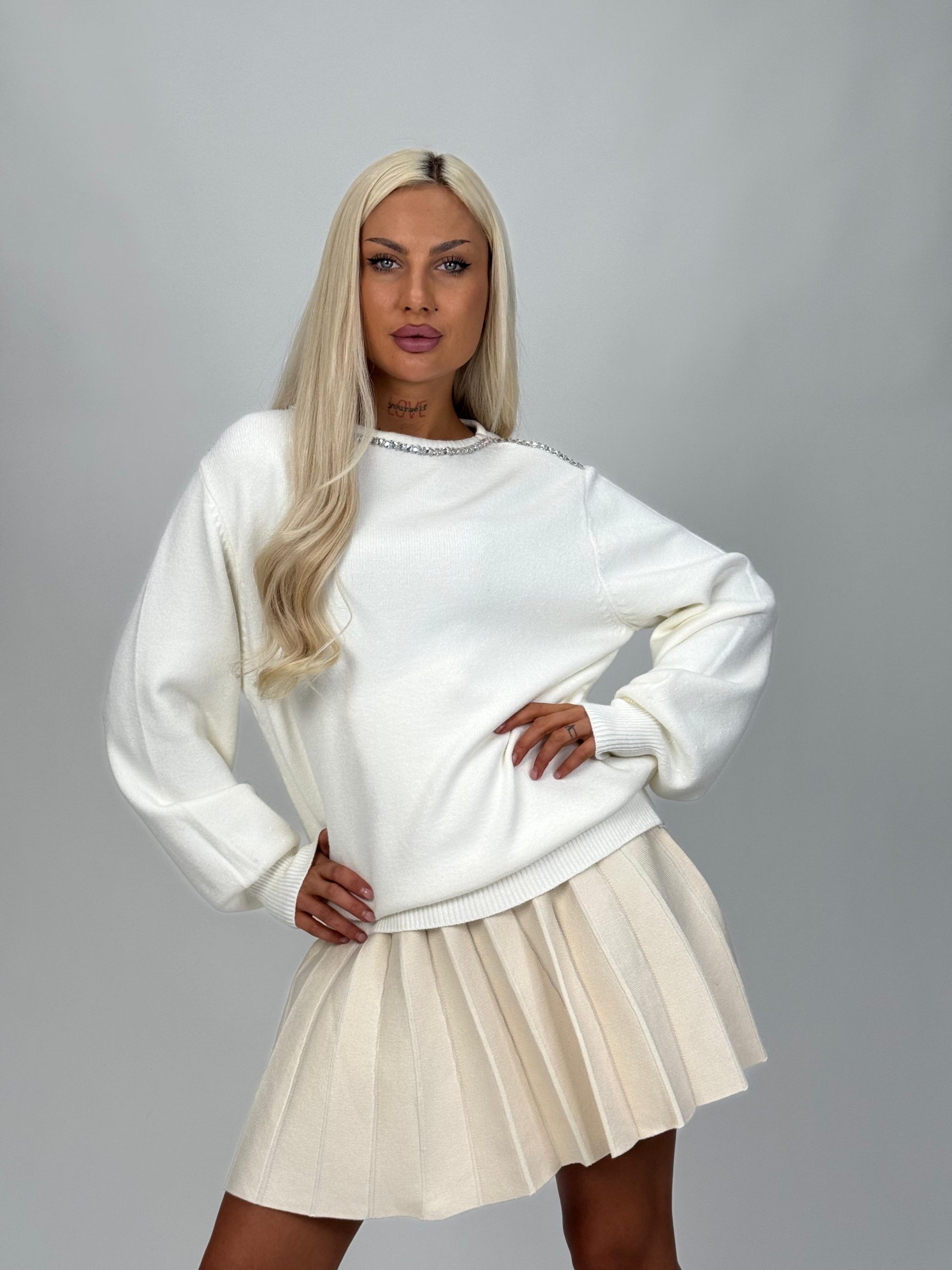 Această piesă este ideală dacă îți dorești să îmbini confortul cu eleganța. Detaliile cu pietre transformă puloverul într-un articol deosebit, care poate fi purtat cu ușurință în orice moment al zilei.