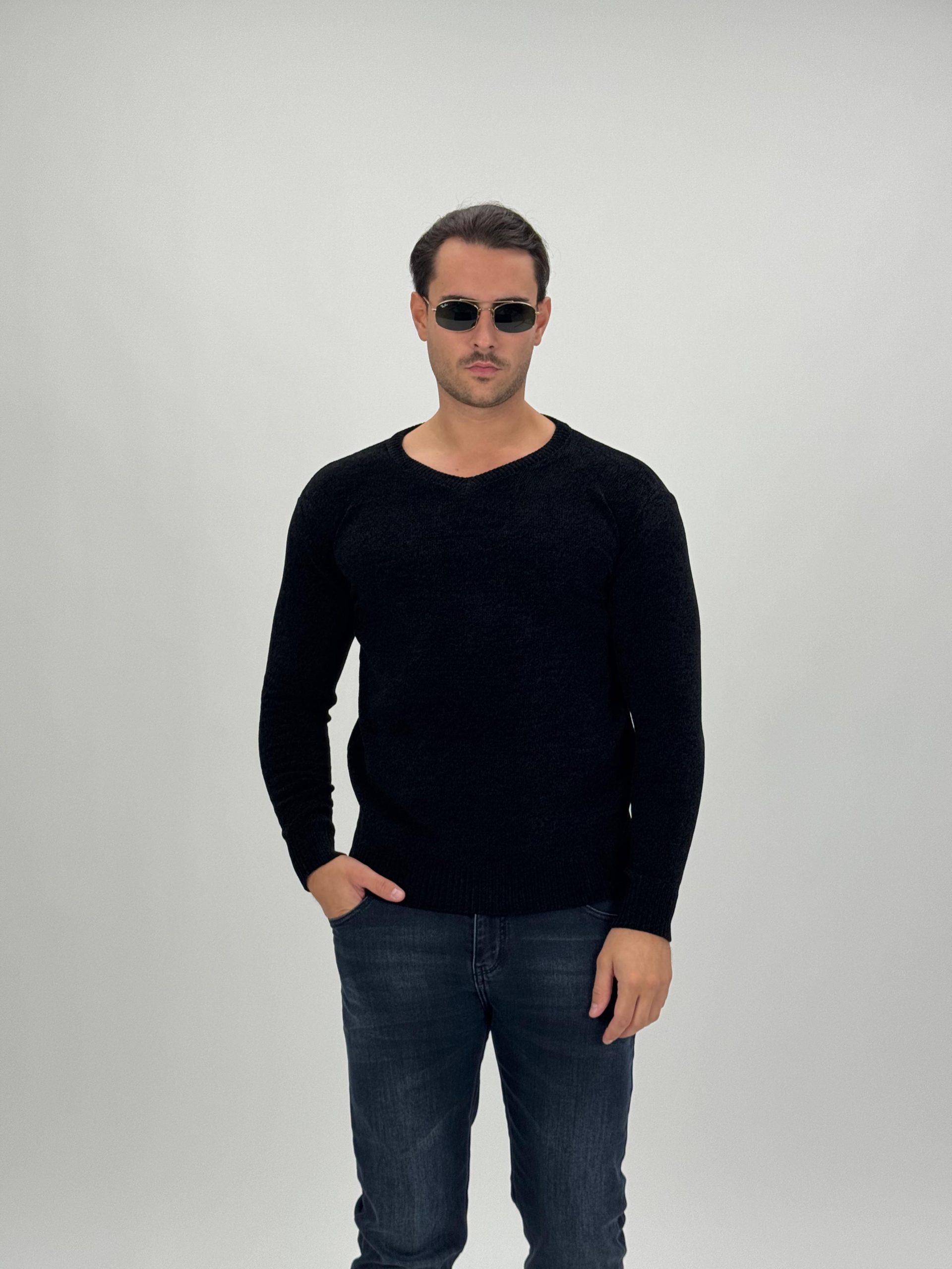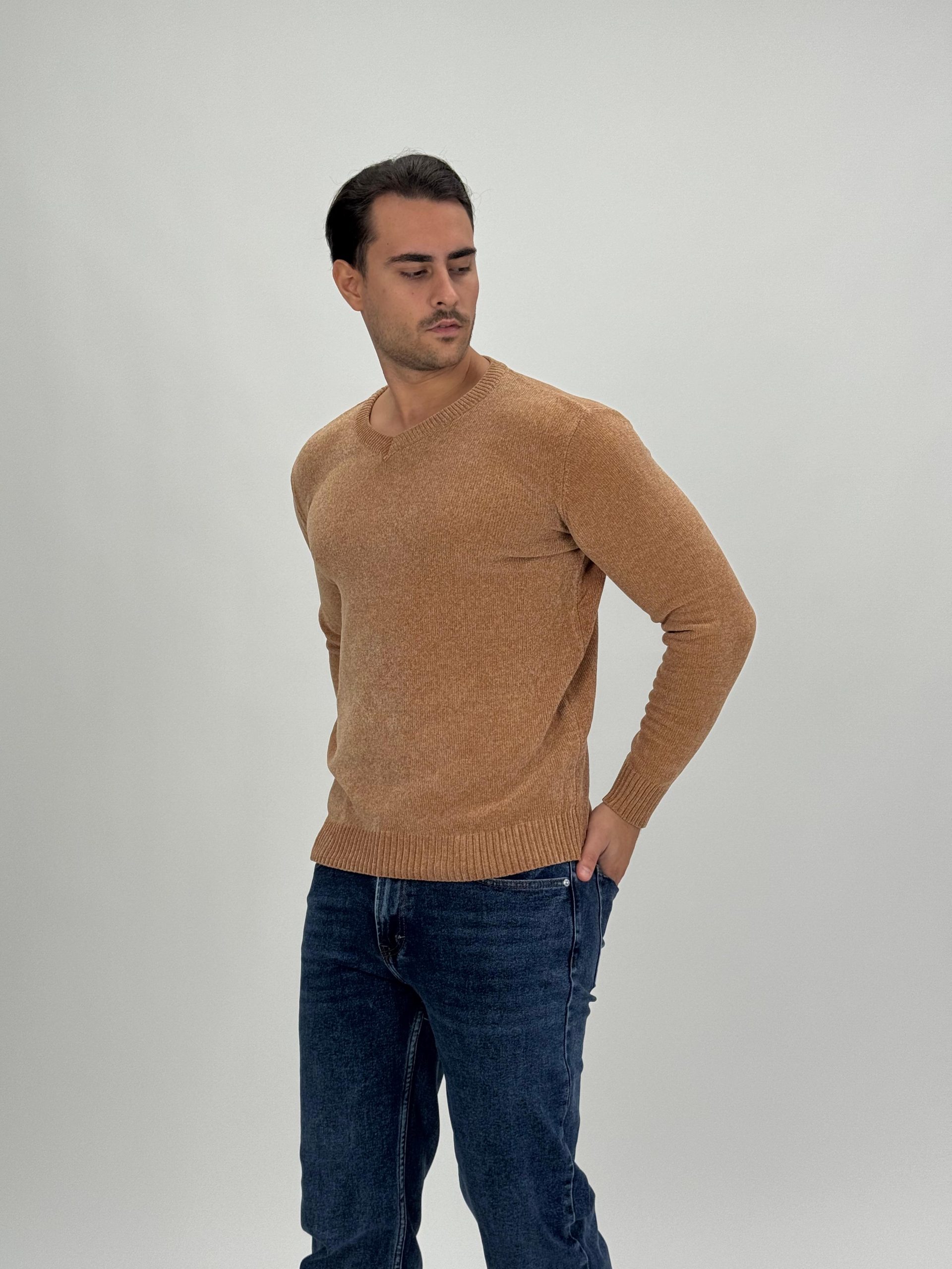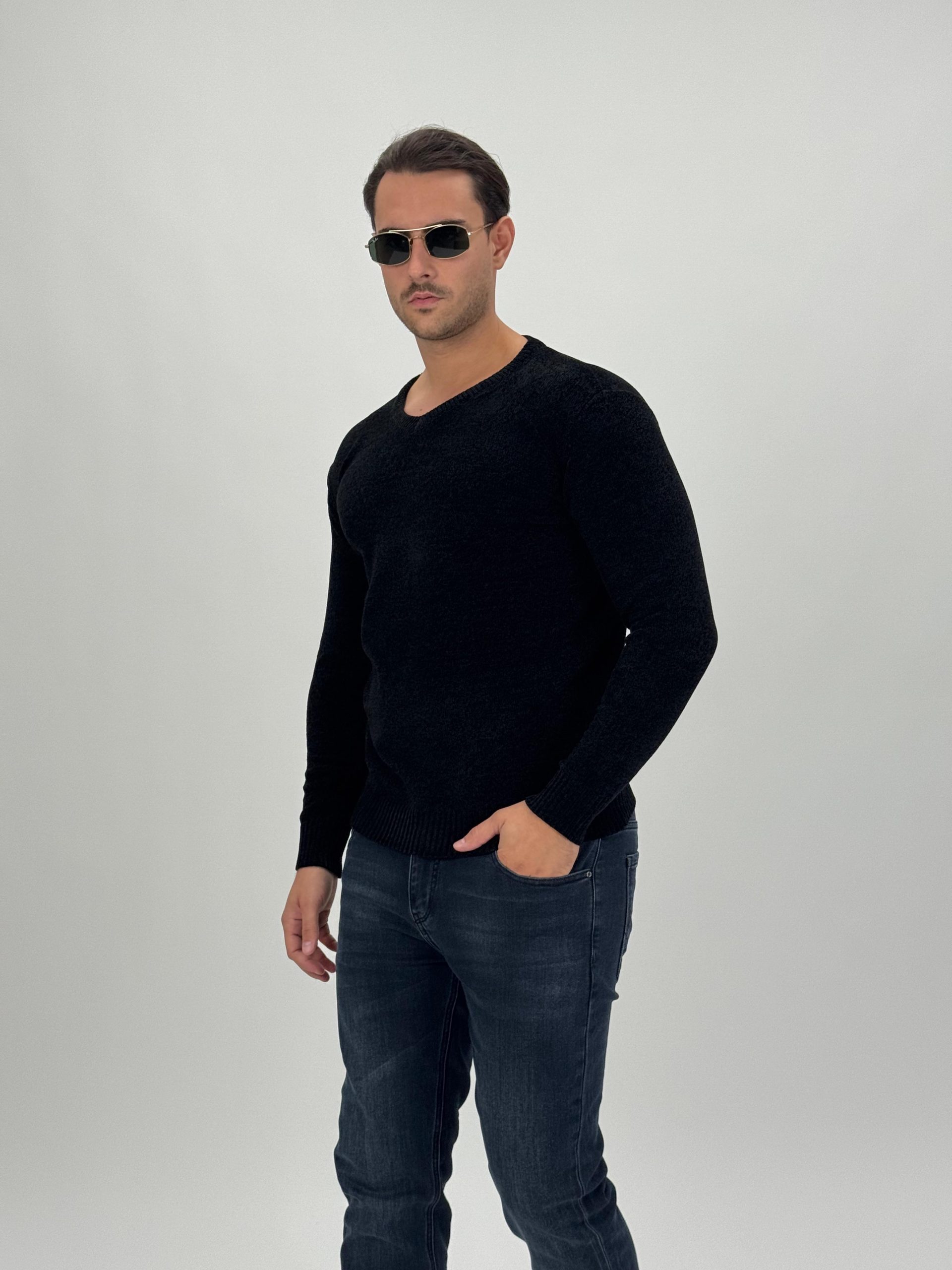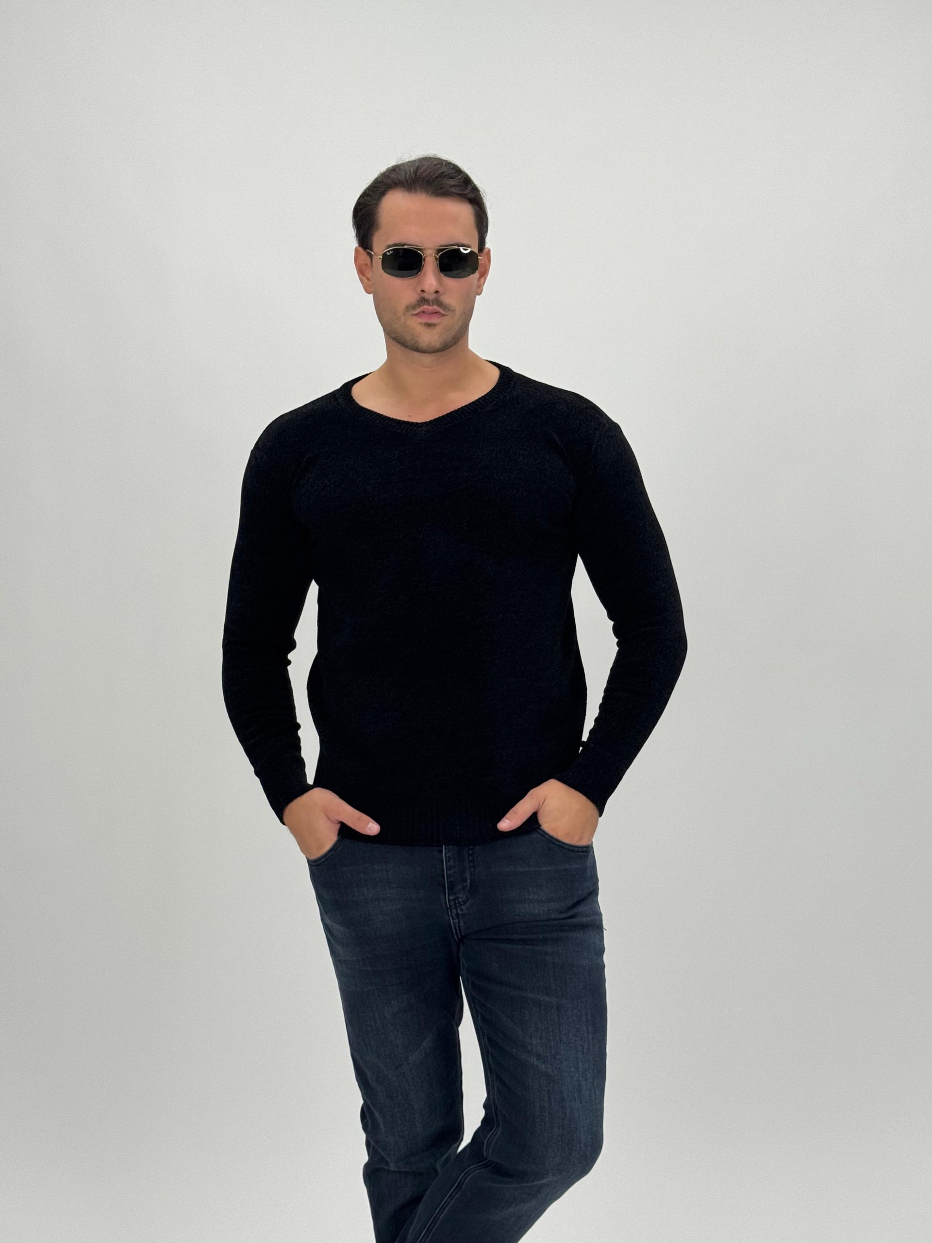 Puloverul din catifea cu decolteu în V combină luxul materialului cu versatilitatea designului, oferind un look modern și rafinat.