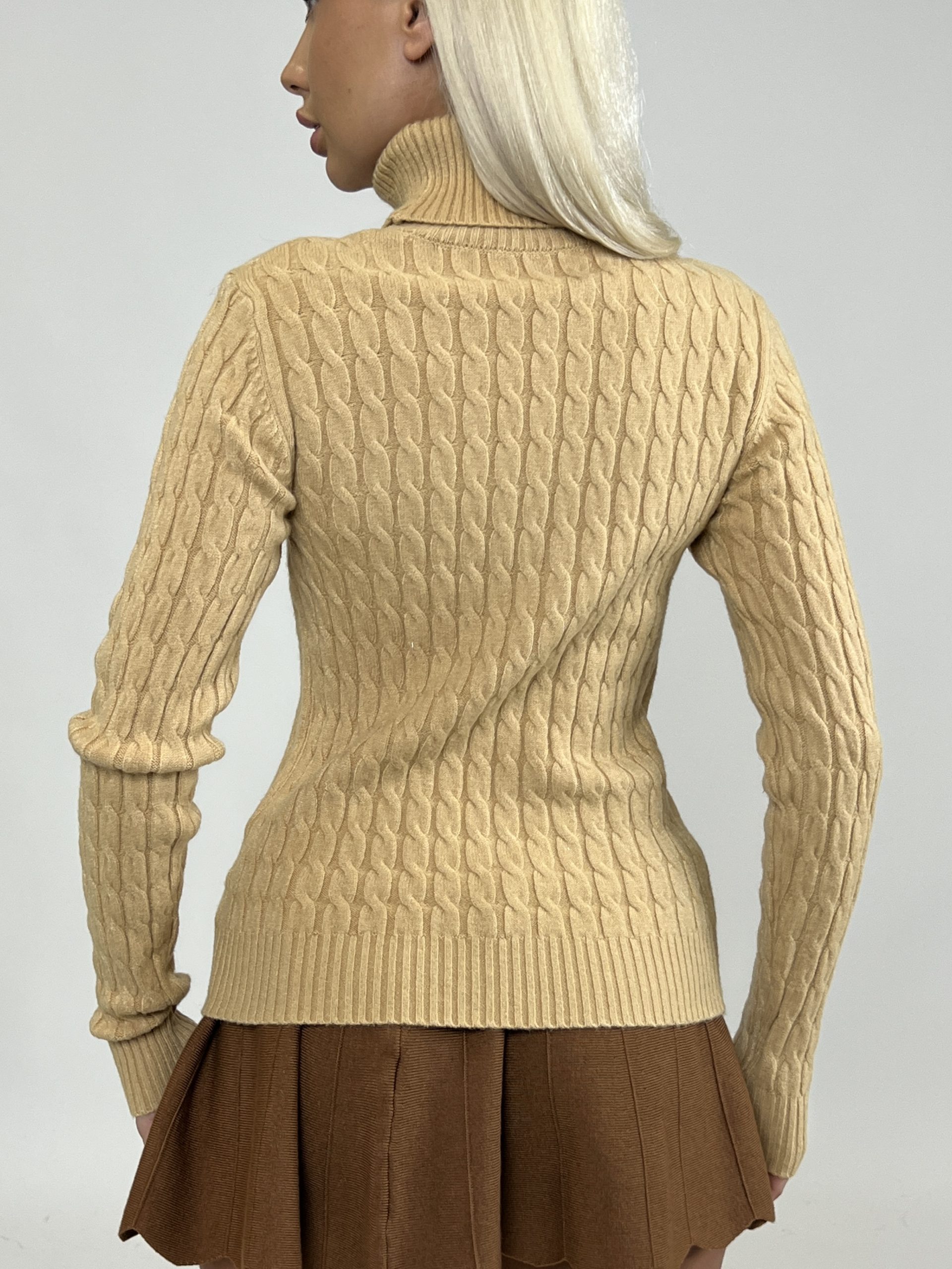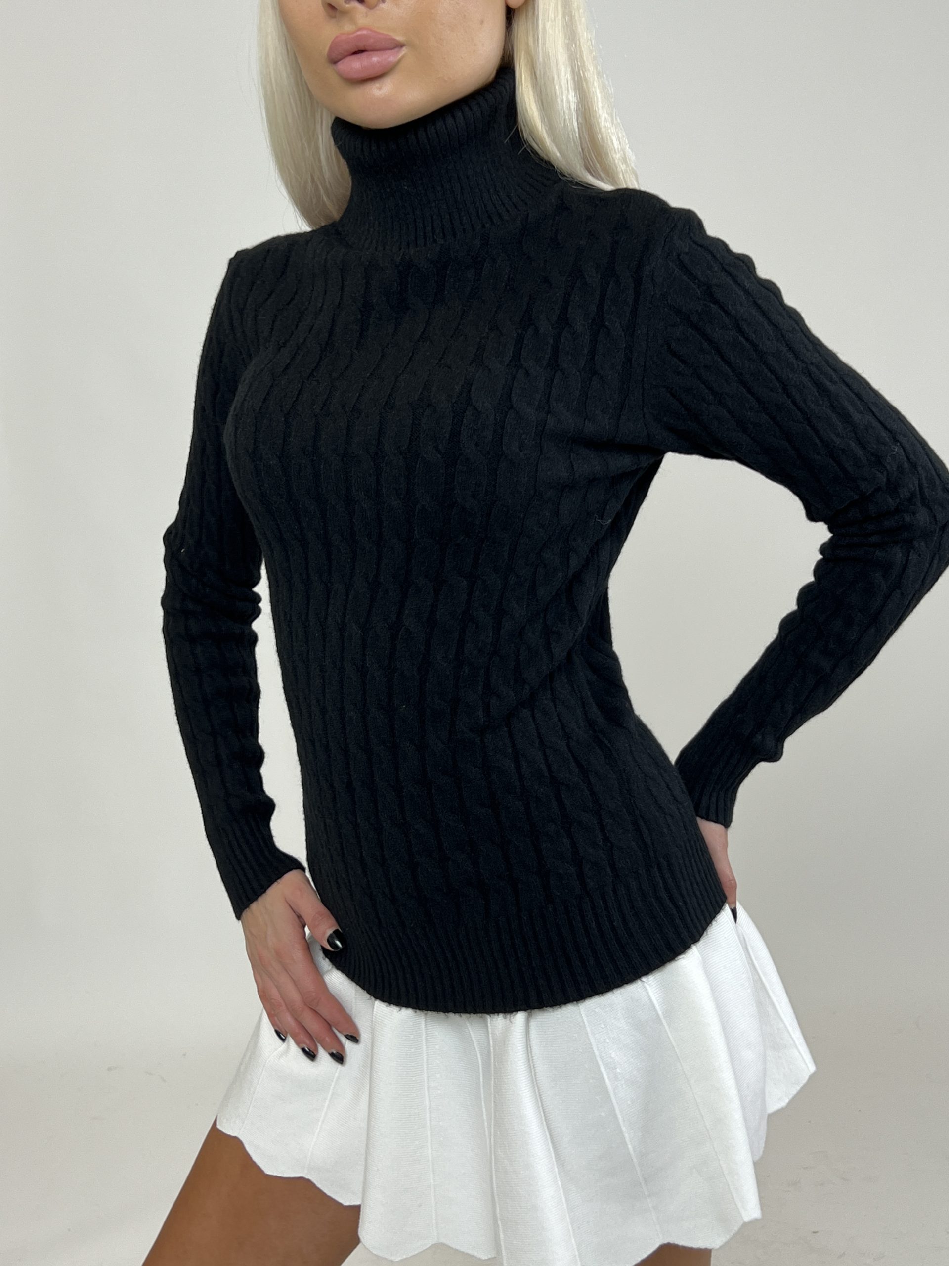 Acest model îmbină clasicul tricotaj torsade cu designul modern al helancii, rezultând o piesă versatilă și stilată. Este perfect pentru a fi purtat singur sau în layering sub sacouri și cardigane, adăugând un plus de personalitate oricărei ținute.