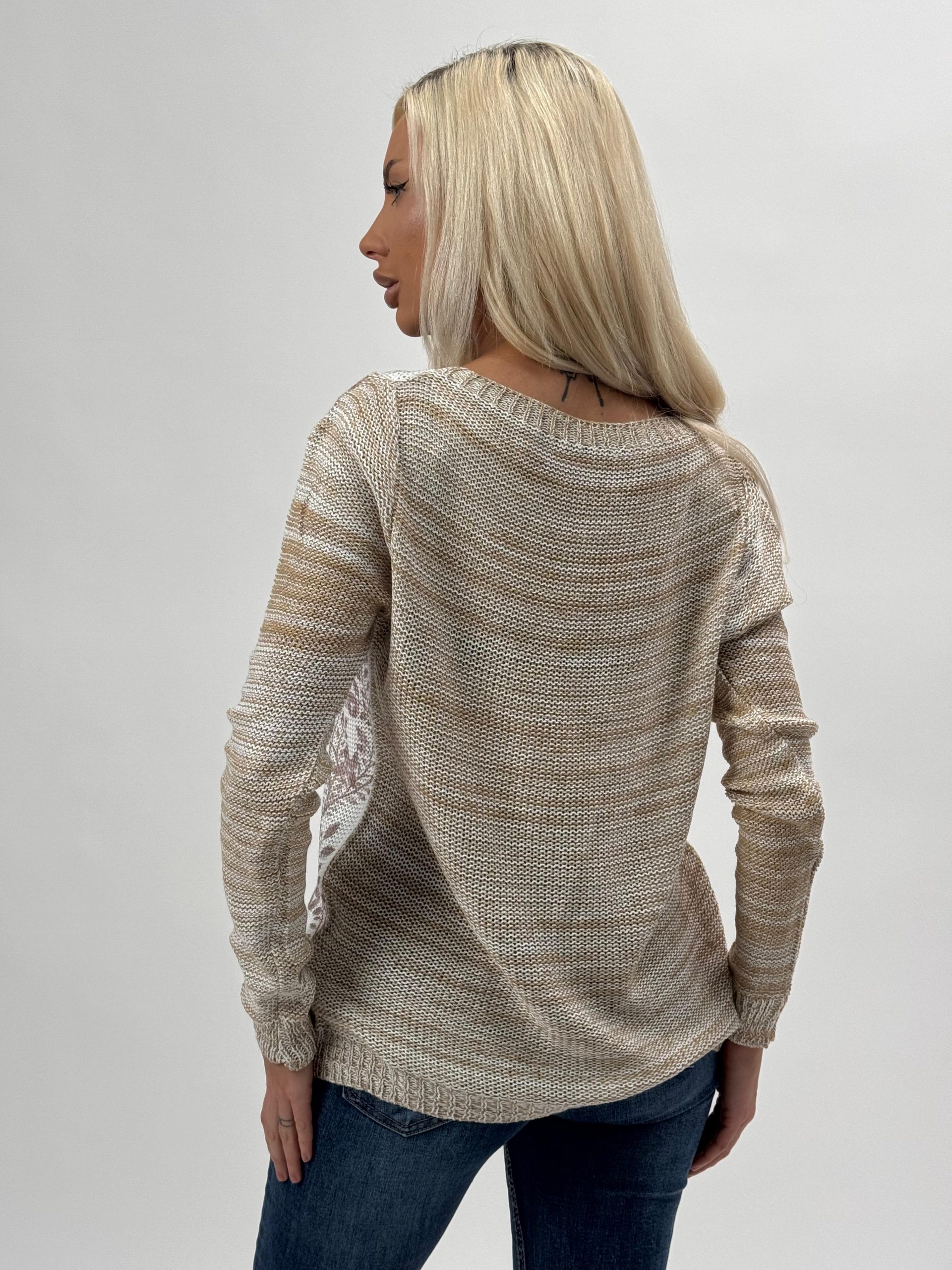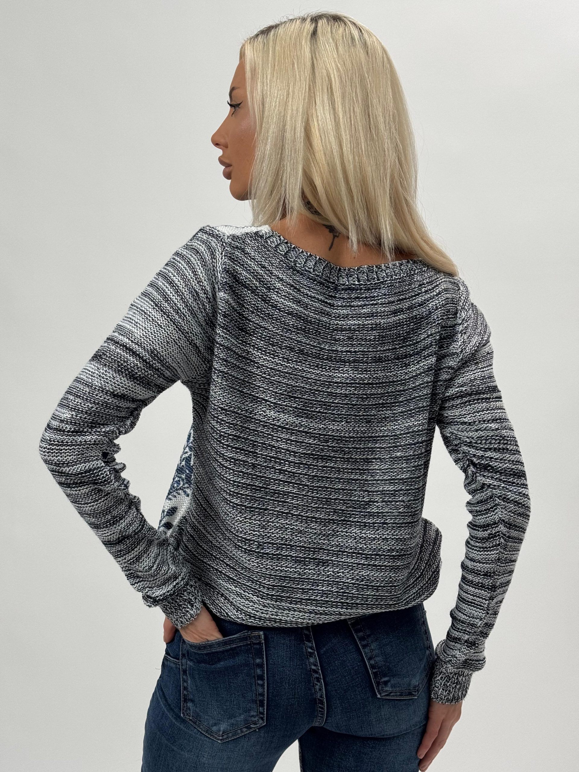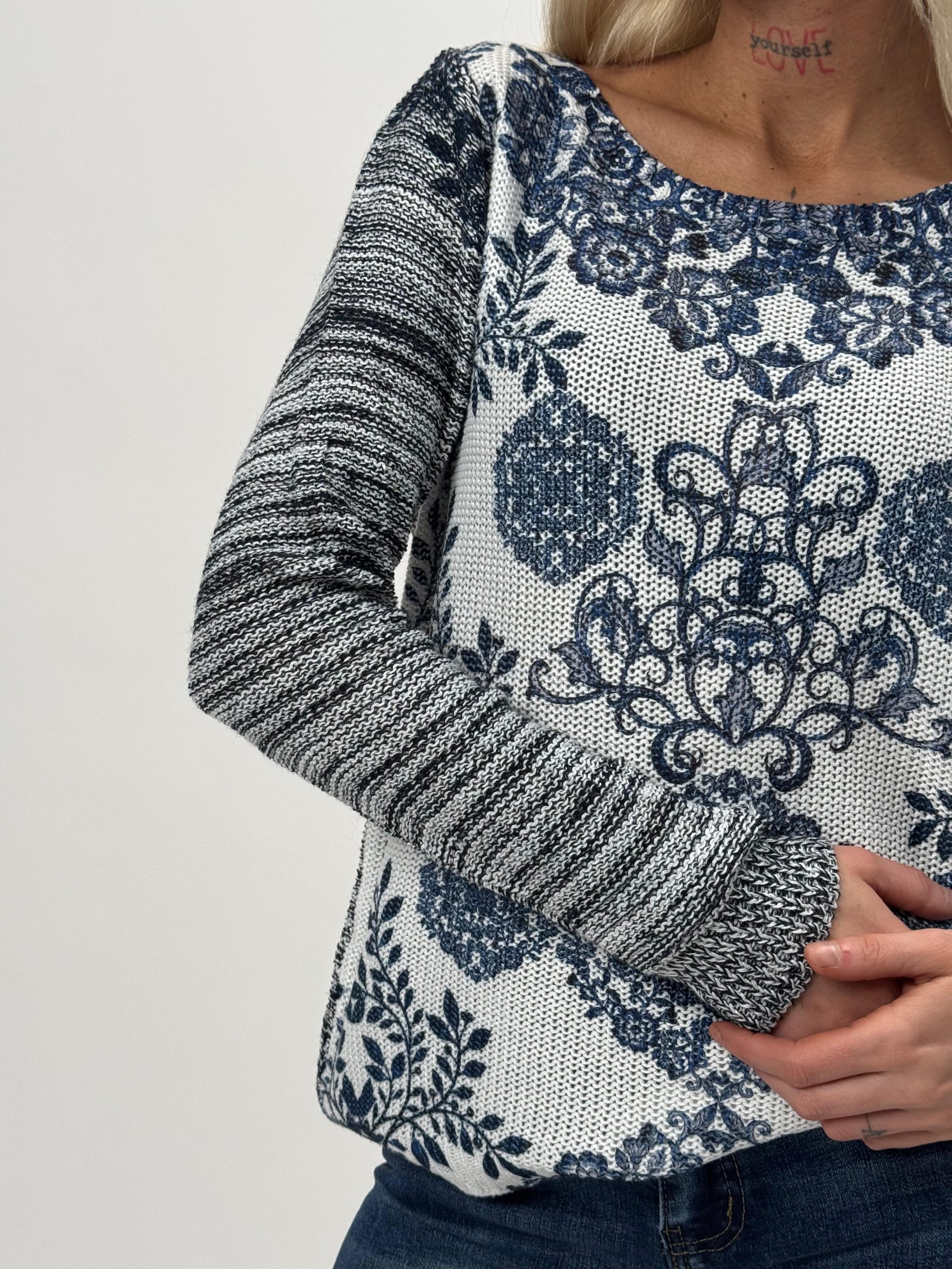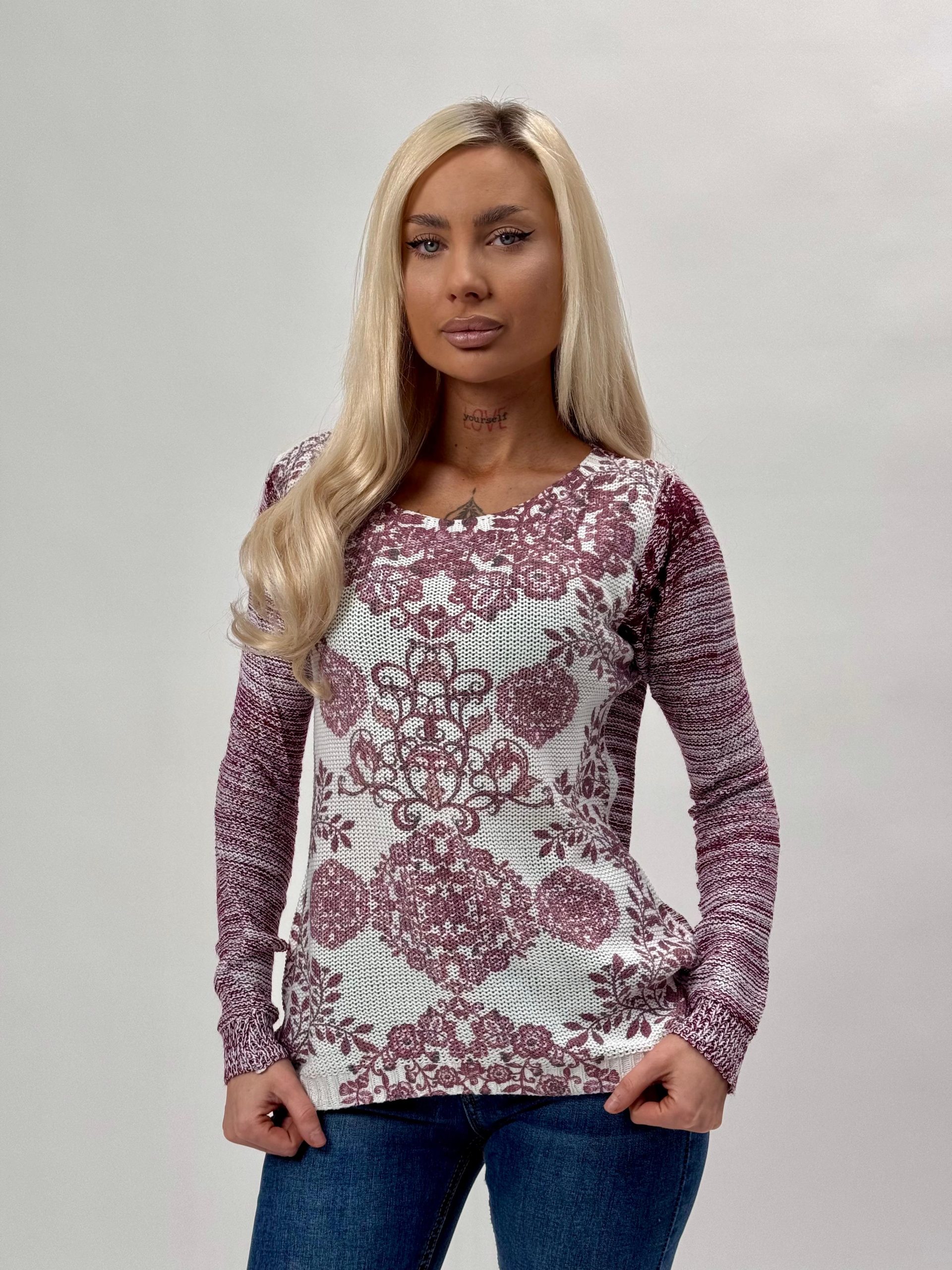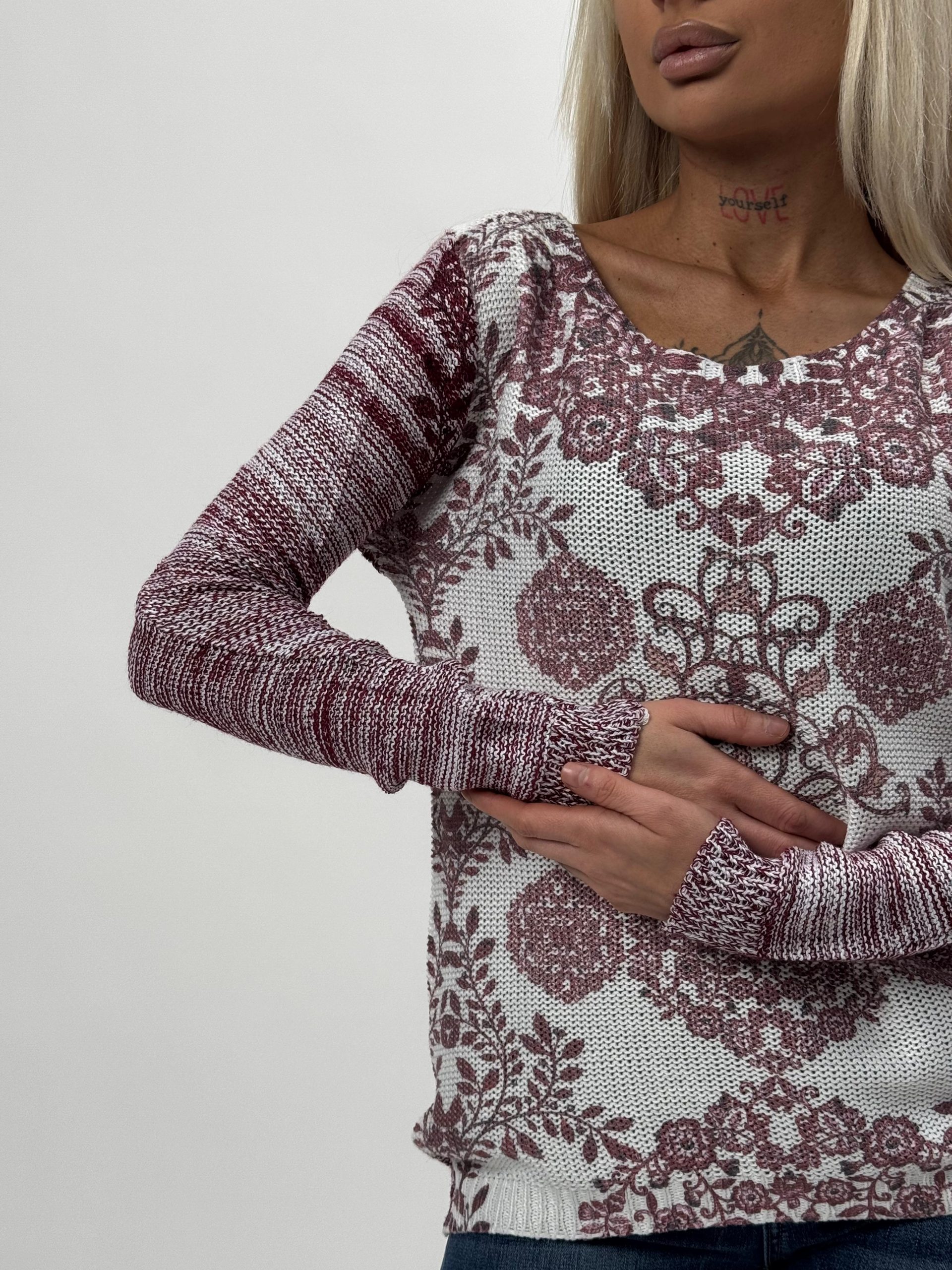 Puloverul se remarcă prin imprimeul baroc complex și detaliat, care adaugă o notă de lux și opulență. Motivele intricate și culorile bogate conferă puloverului un aspect elegant, ideal pentru ocazii speciale sau pentru a adăuga un plus de stil ținutelor zilnice.