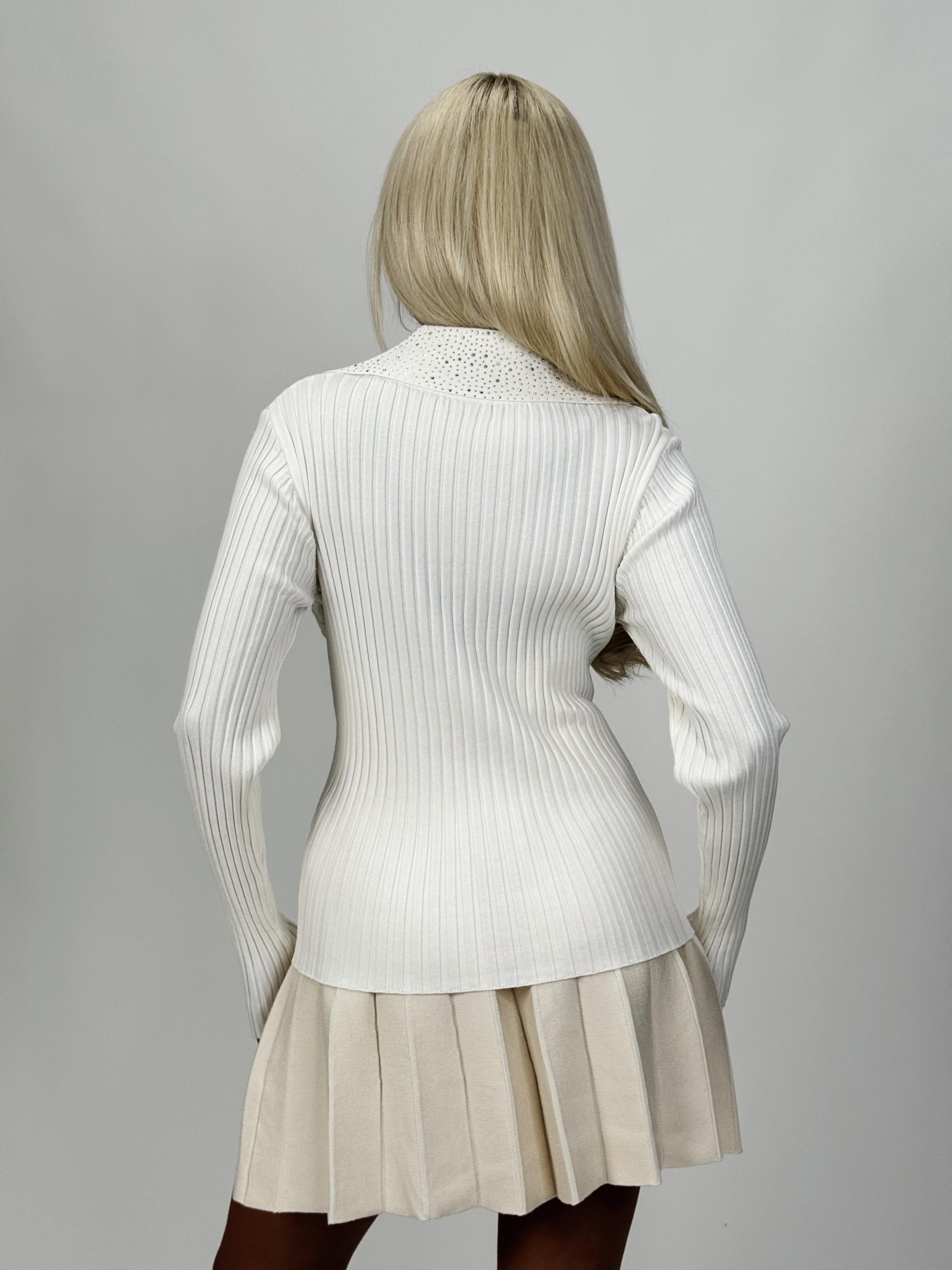 Pulover Rigat cu Guler cu Ștrasuri – Eleganță și Confor