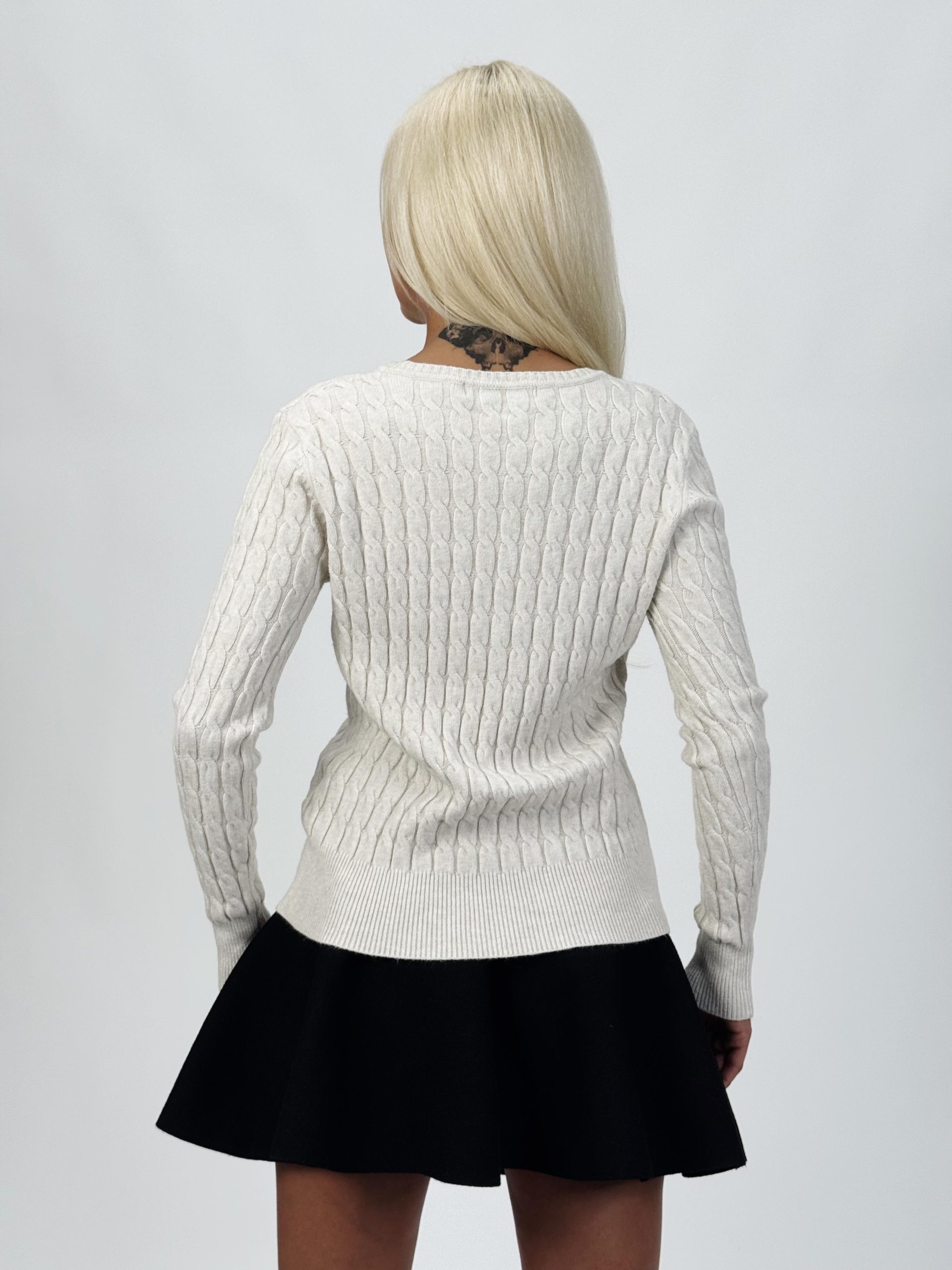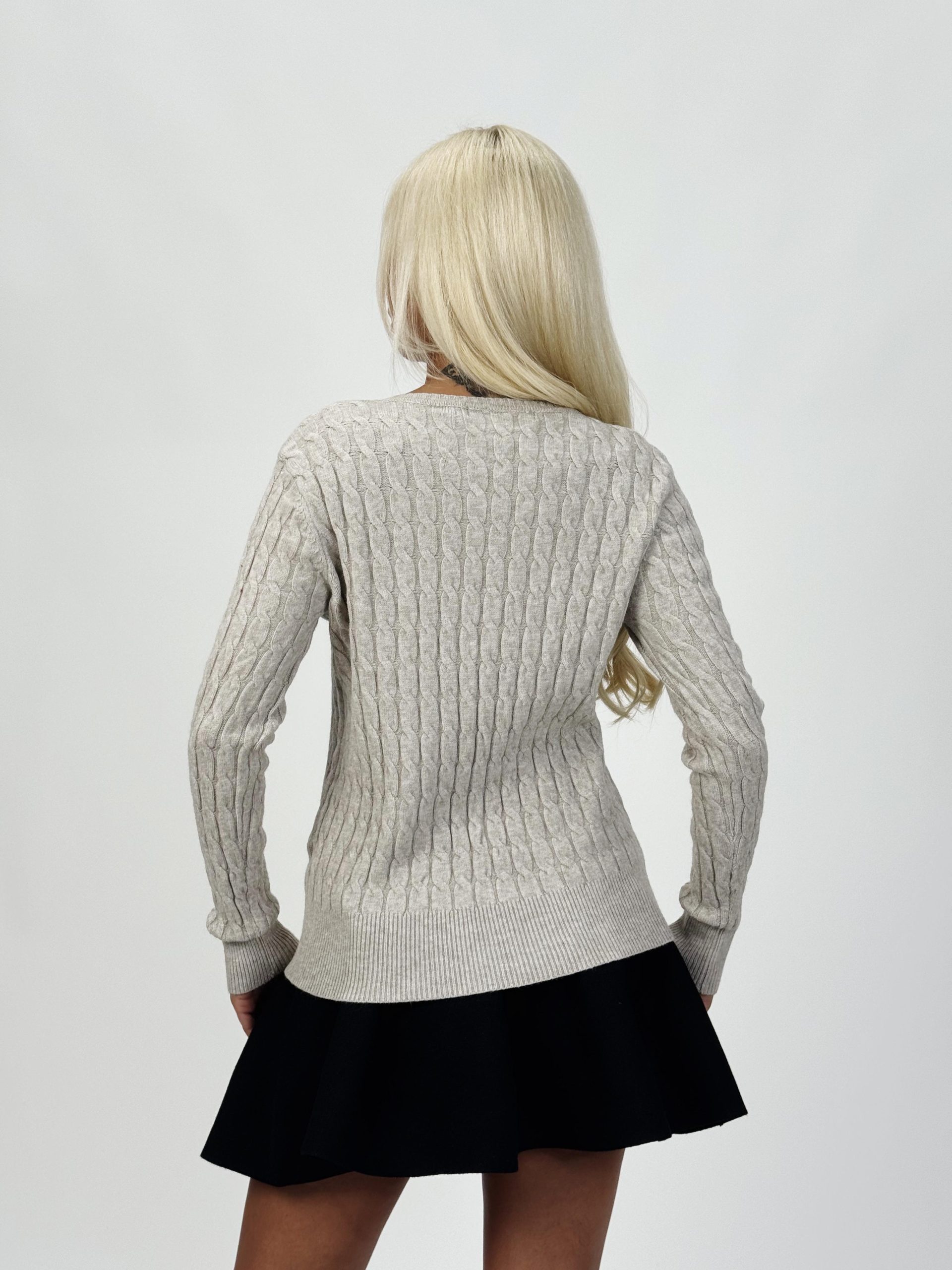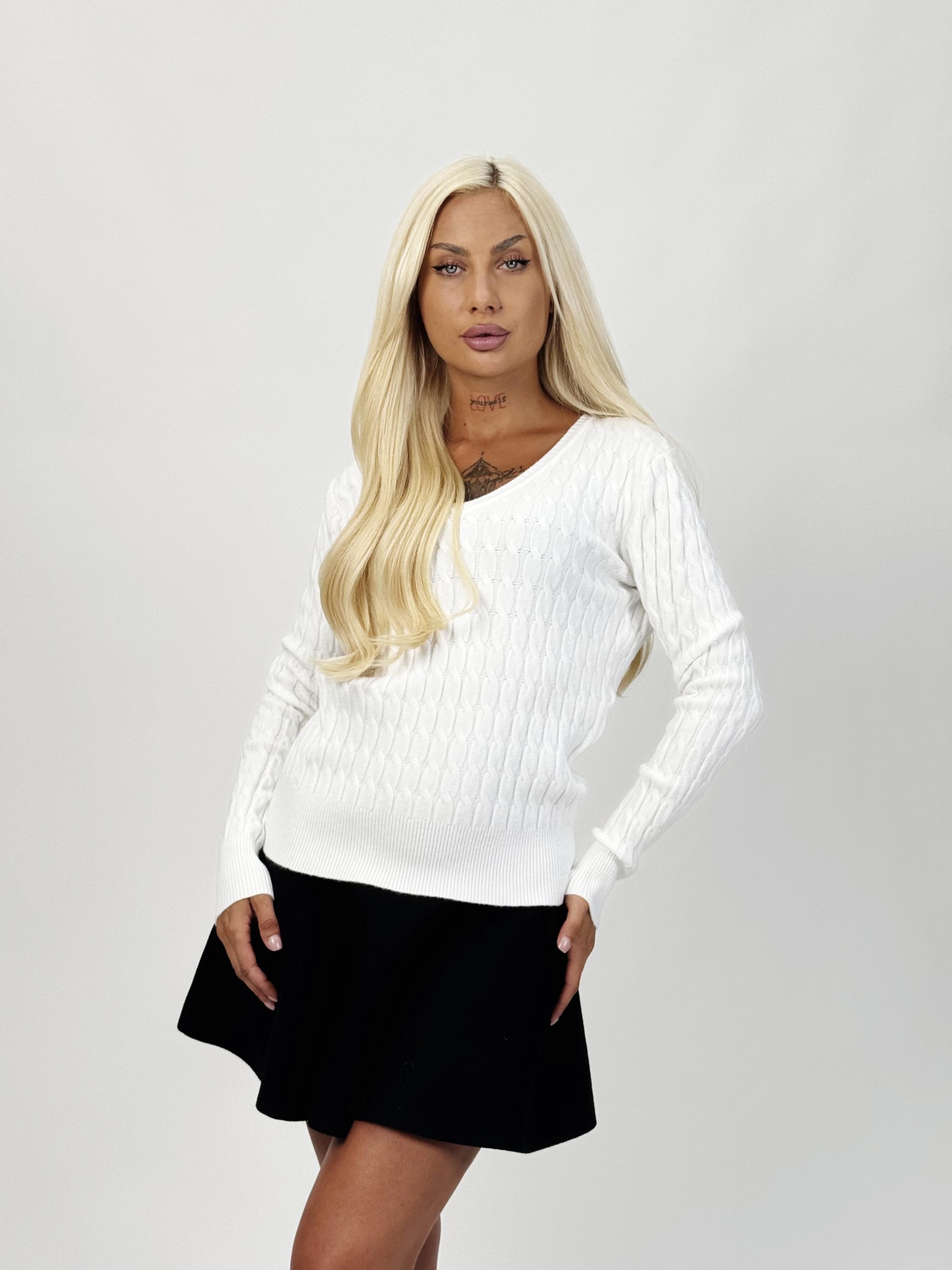 Acest pulover nu este doar confortabil, ci și un element de stil. Modelul torsade creează un efect vizual plăcut, iar decolteul în V avantajează orice siluetă, conferind un aer feminin.