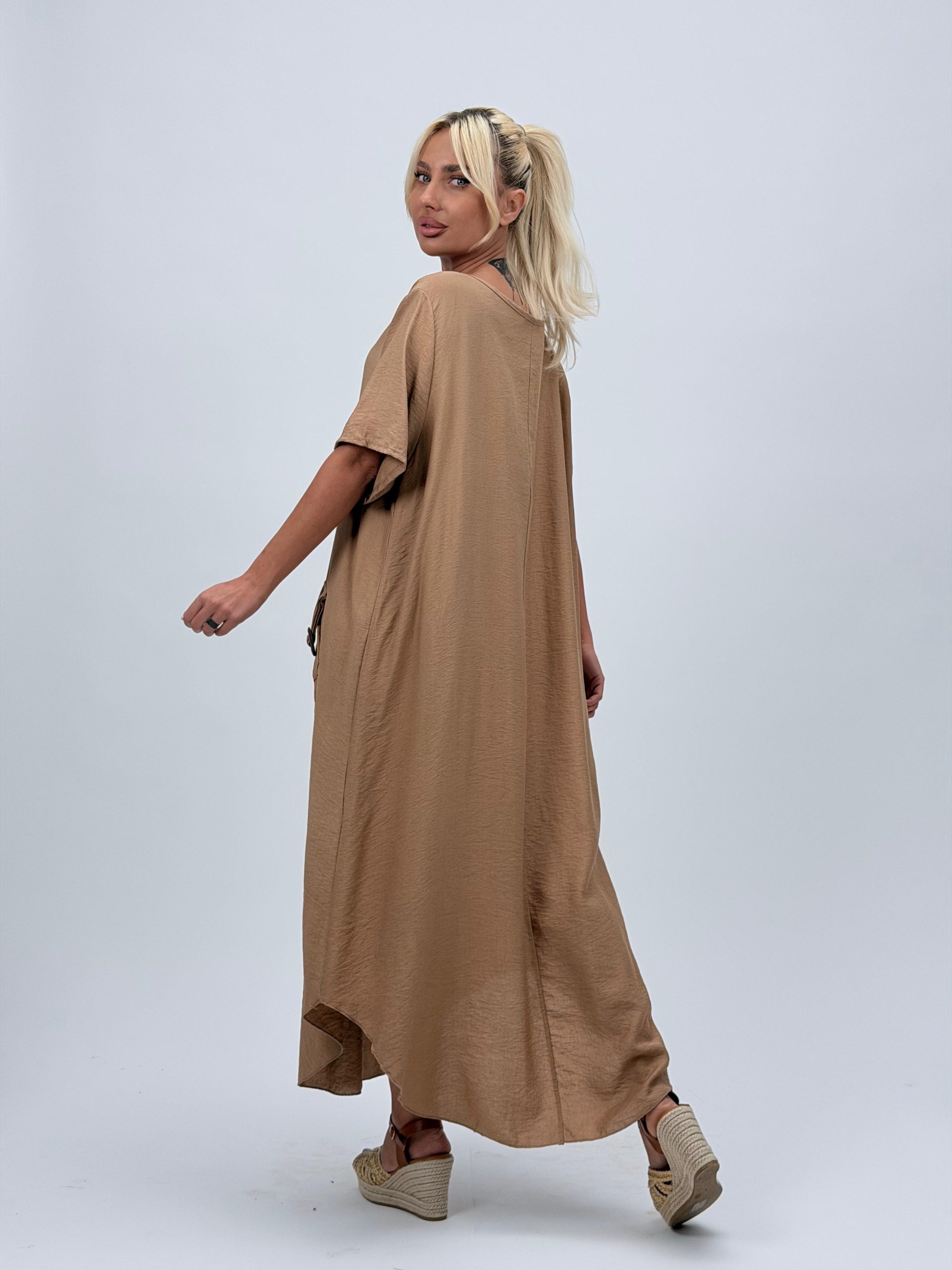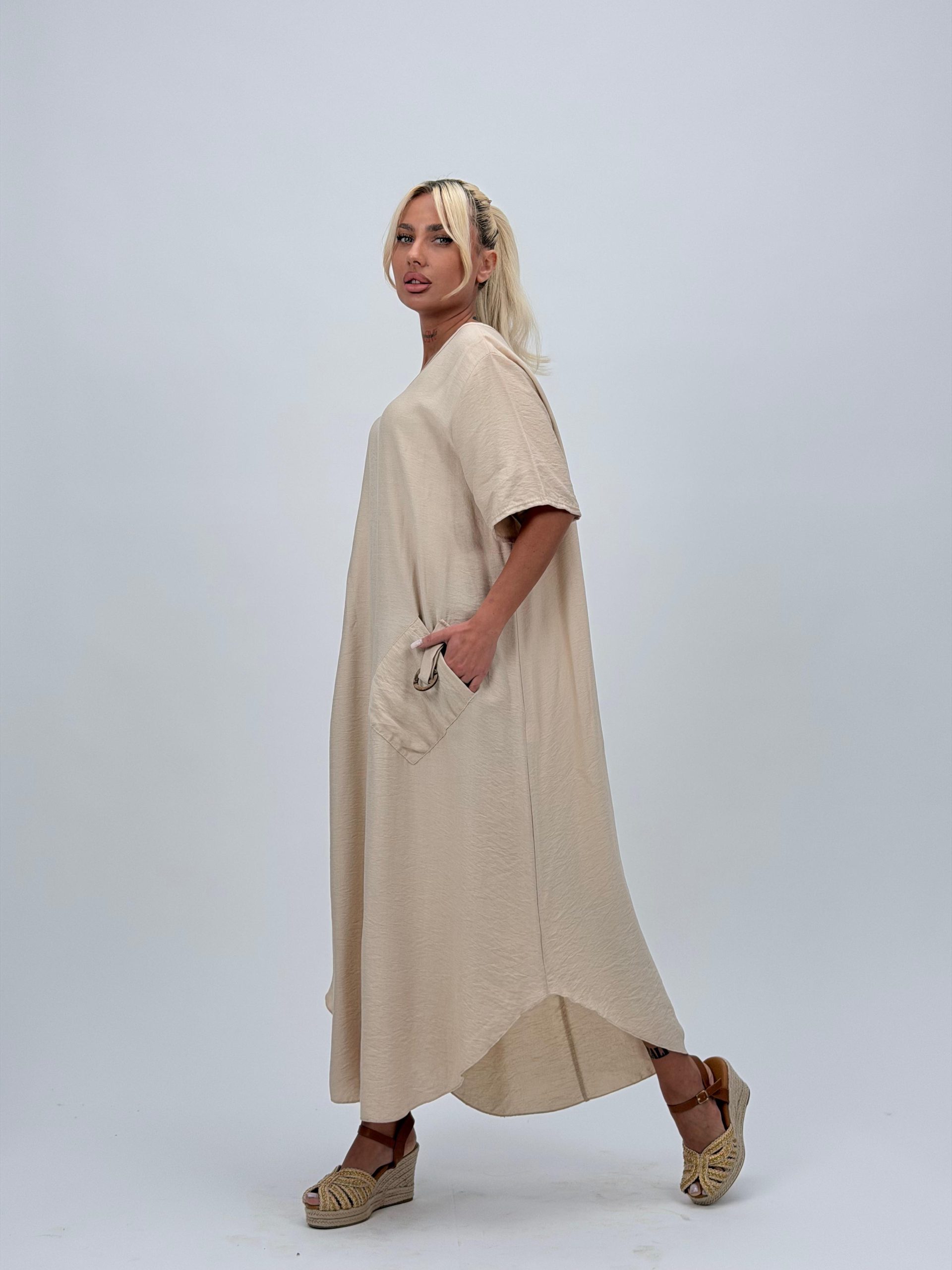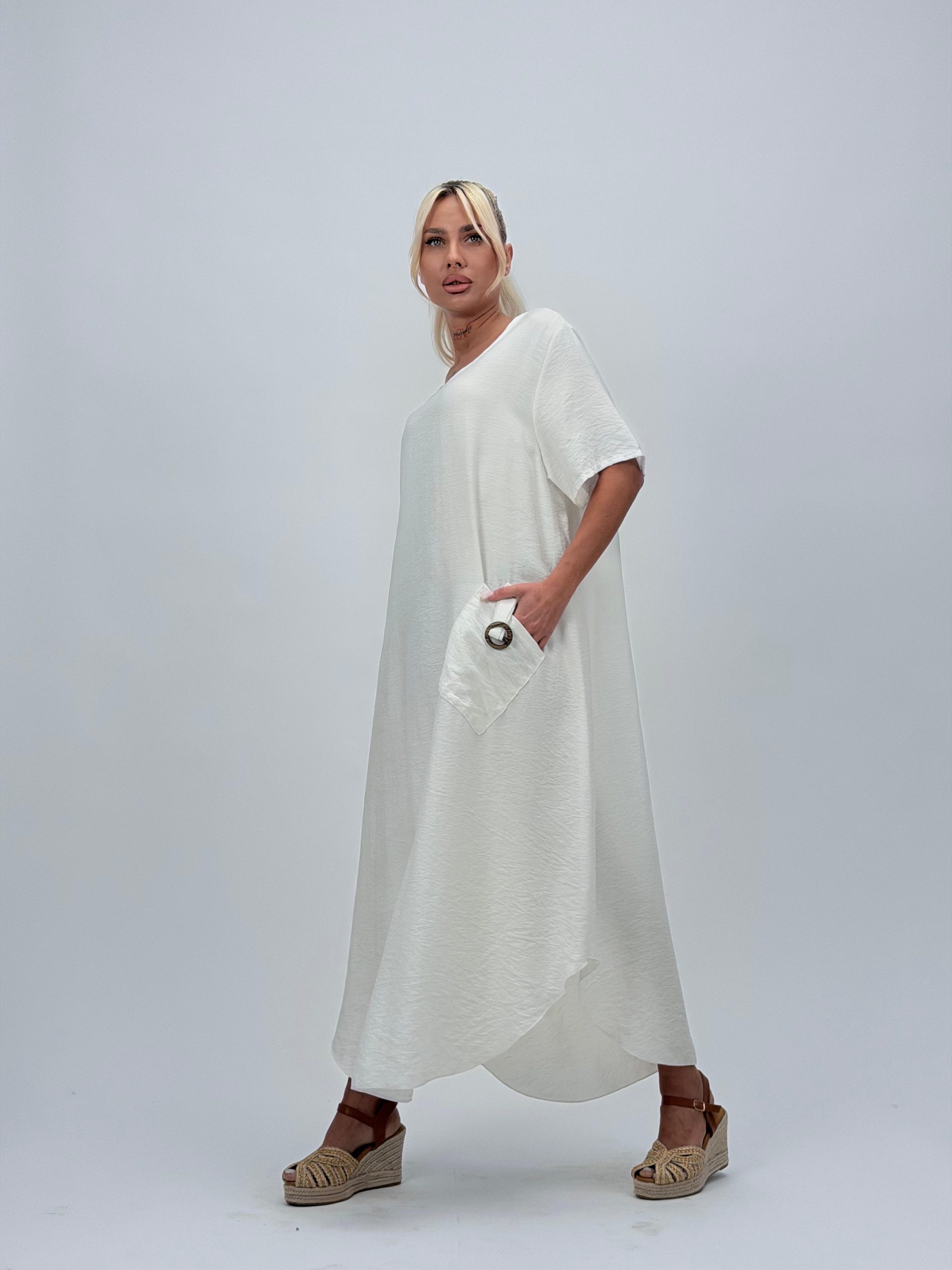 Rochie vaporoasă cu mânecă scurtă și buzunare ascunse
