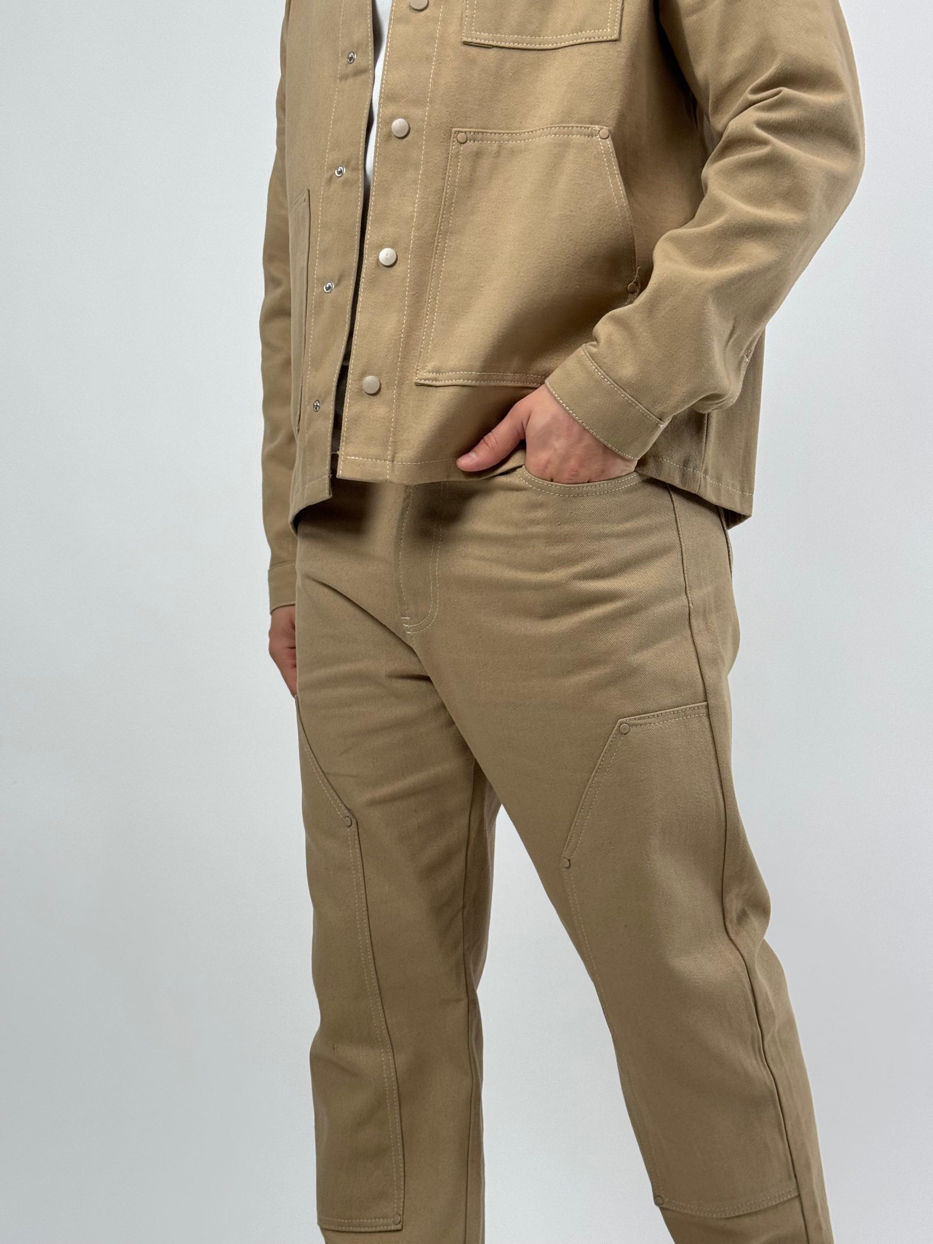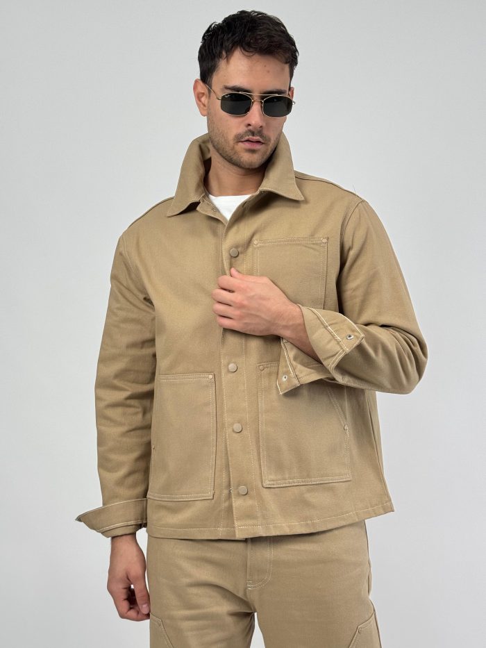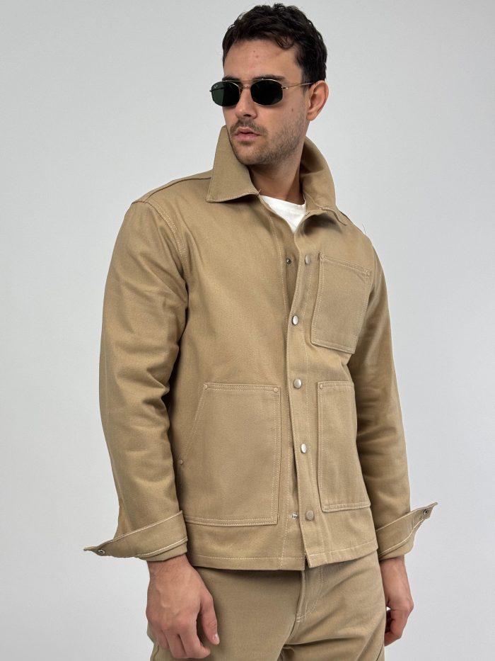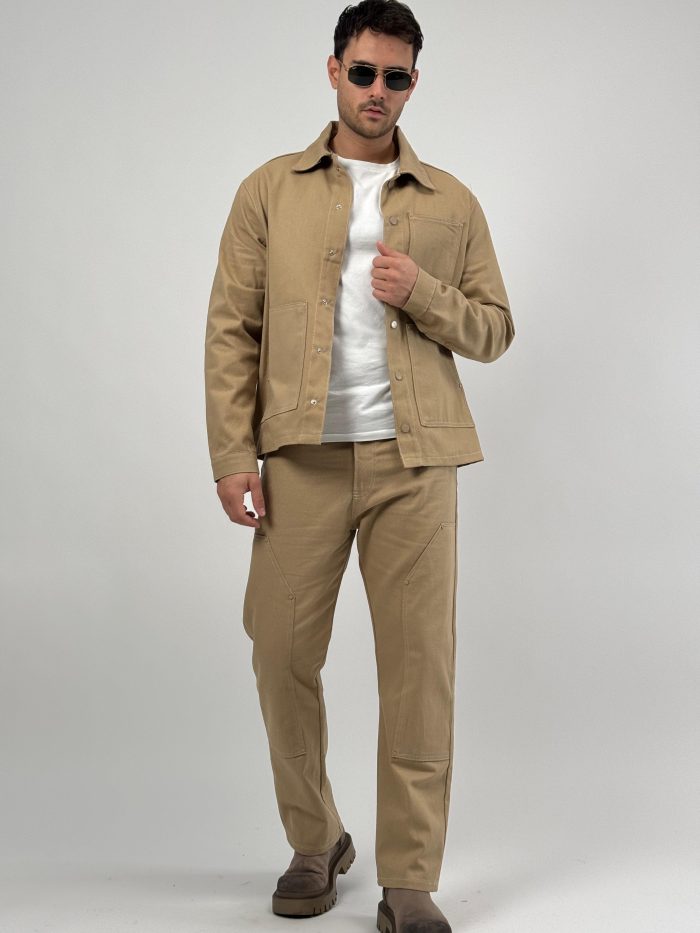 Spre deosebire de denimul clasic rigid, acest set este confecționat dintr-un denim bej moale, cu o textură plăcută și maleabilă, perfect adaptat pentru purtare zilnică. Materialul are o grosime ideală pentru a fi purtat tot timpul anului, oferind confort fără a sacrifica structura pieselor.