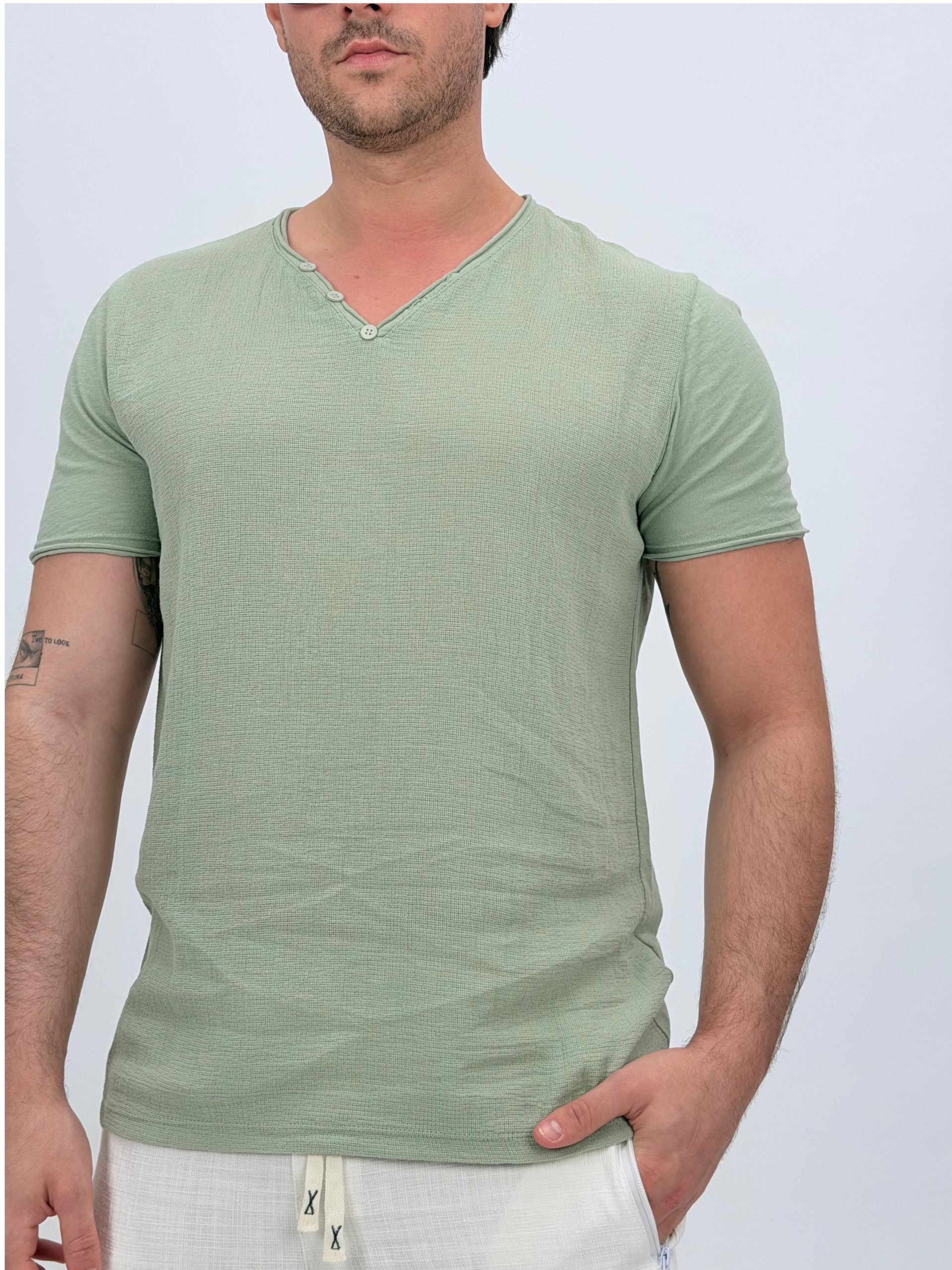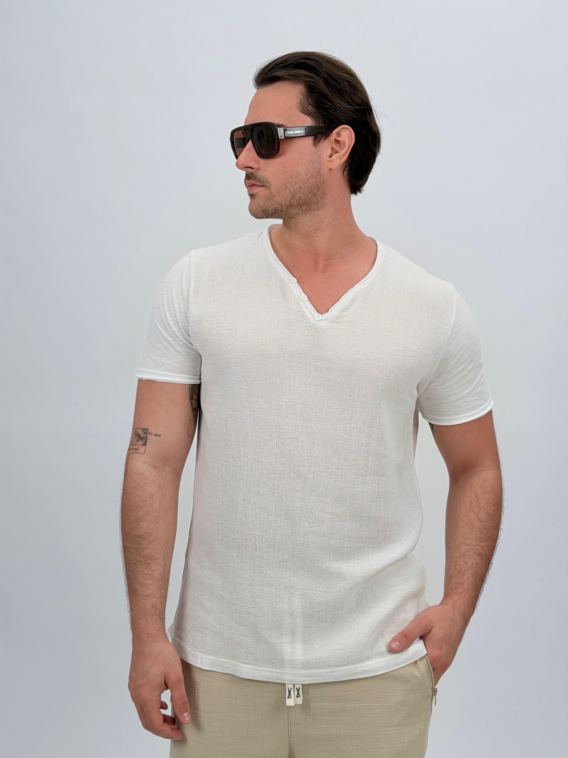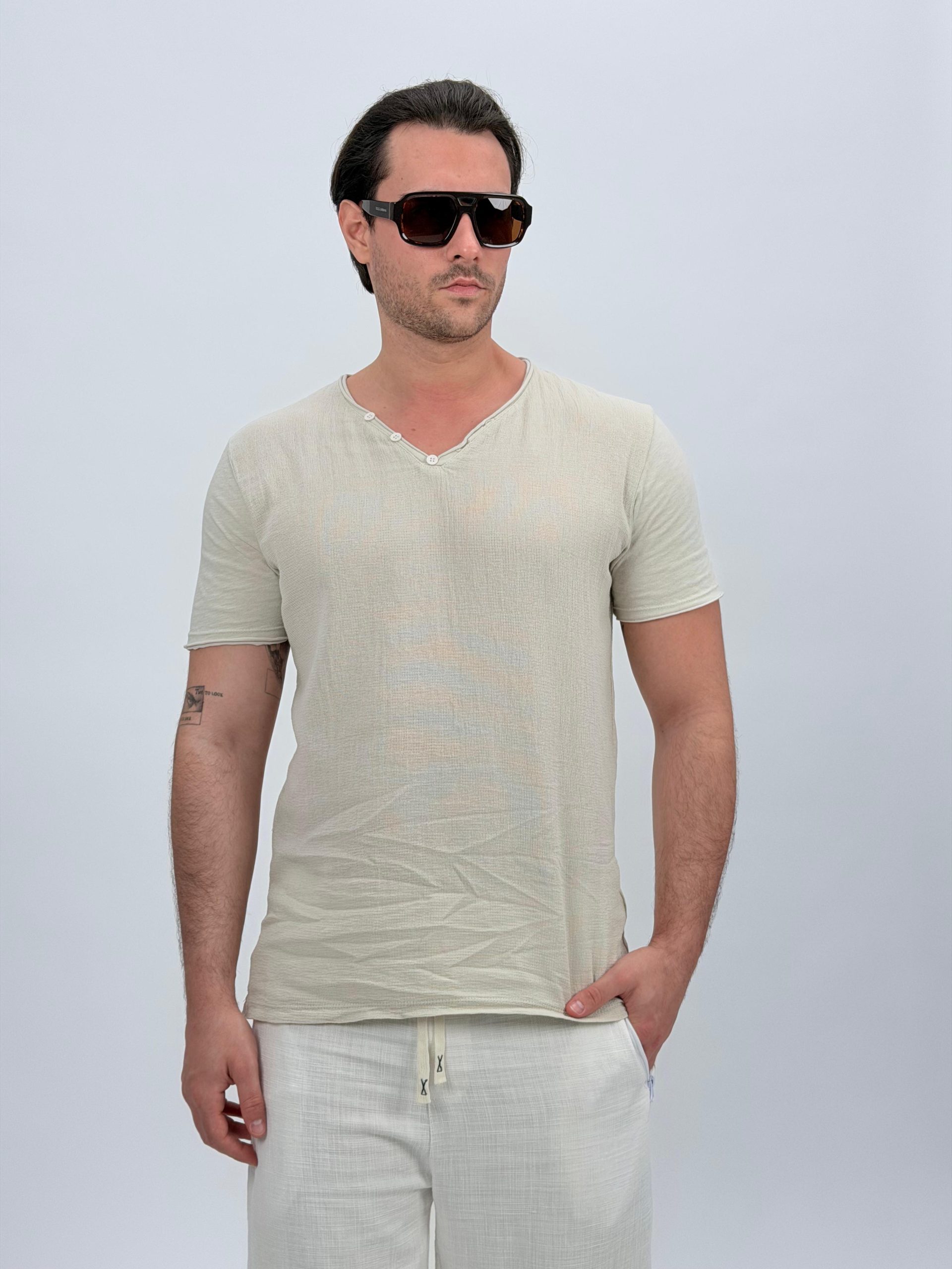 Tricou din in cu decolteu în V și nasturi