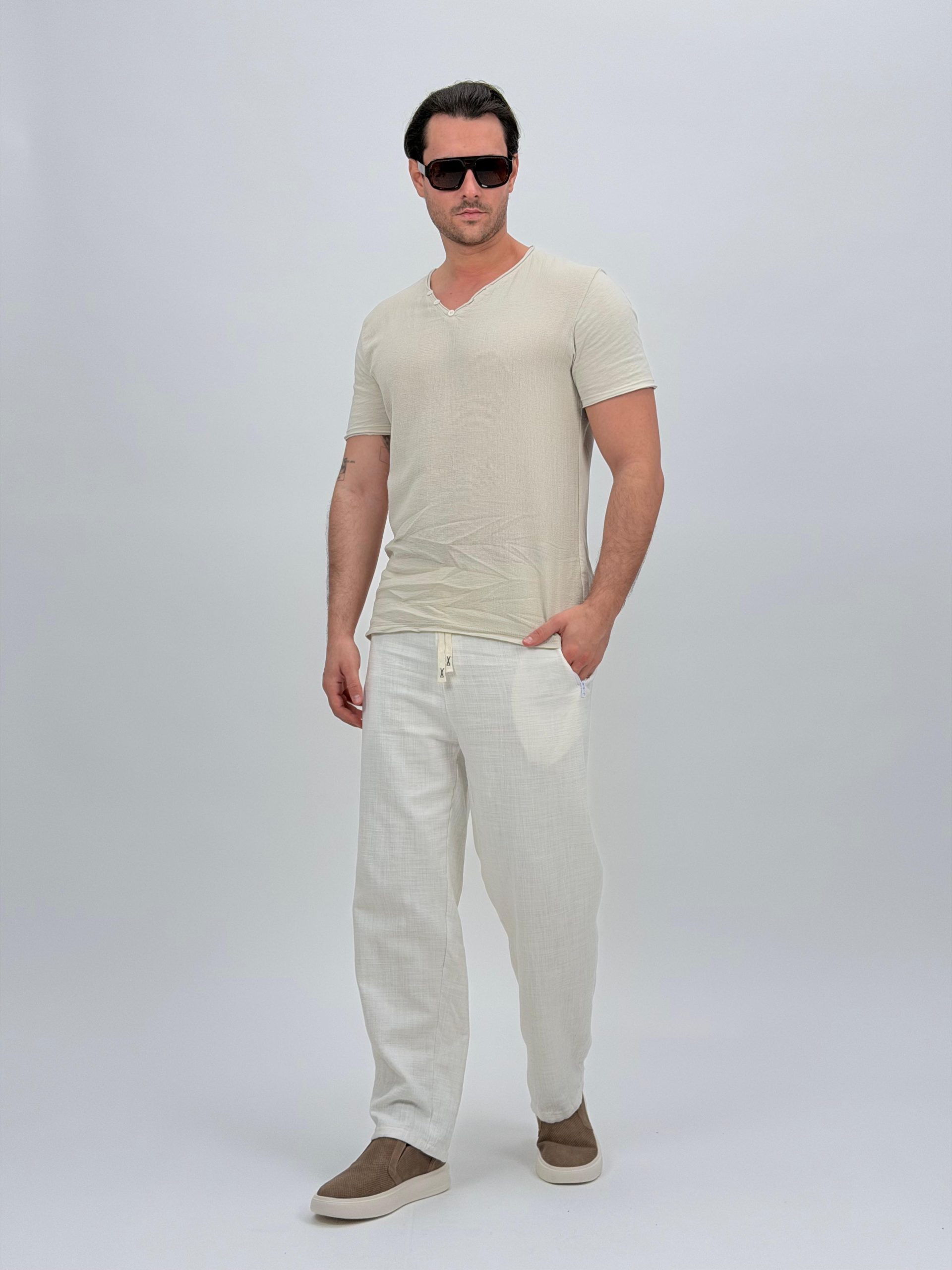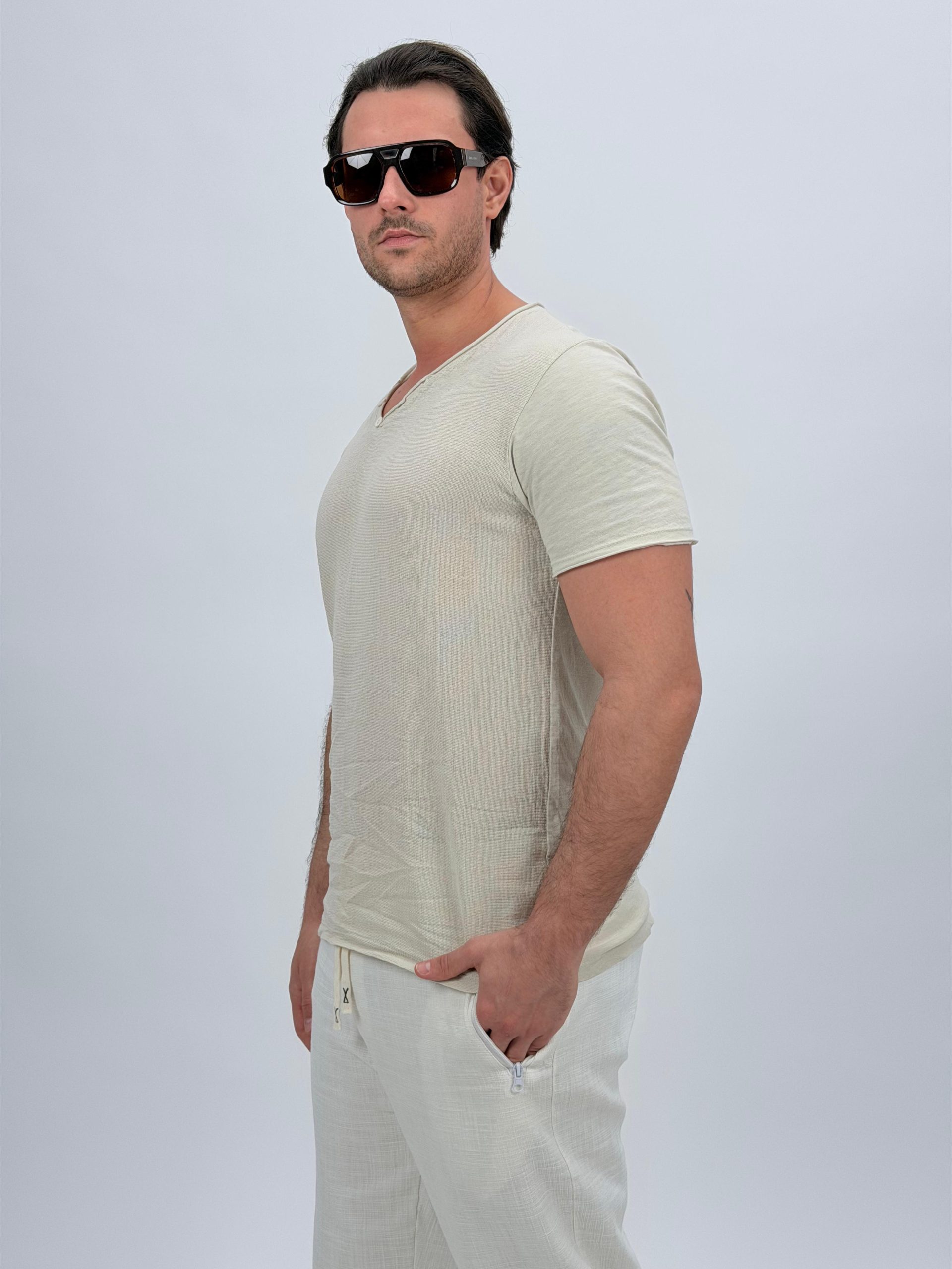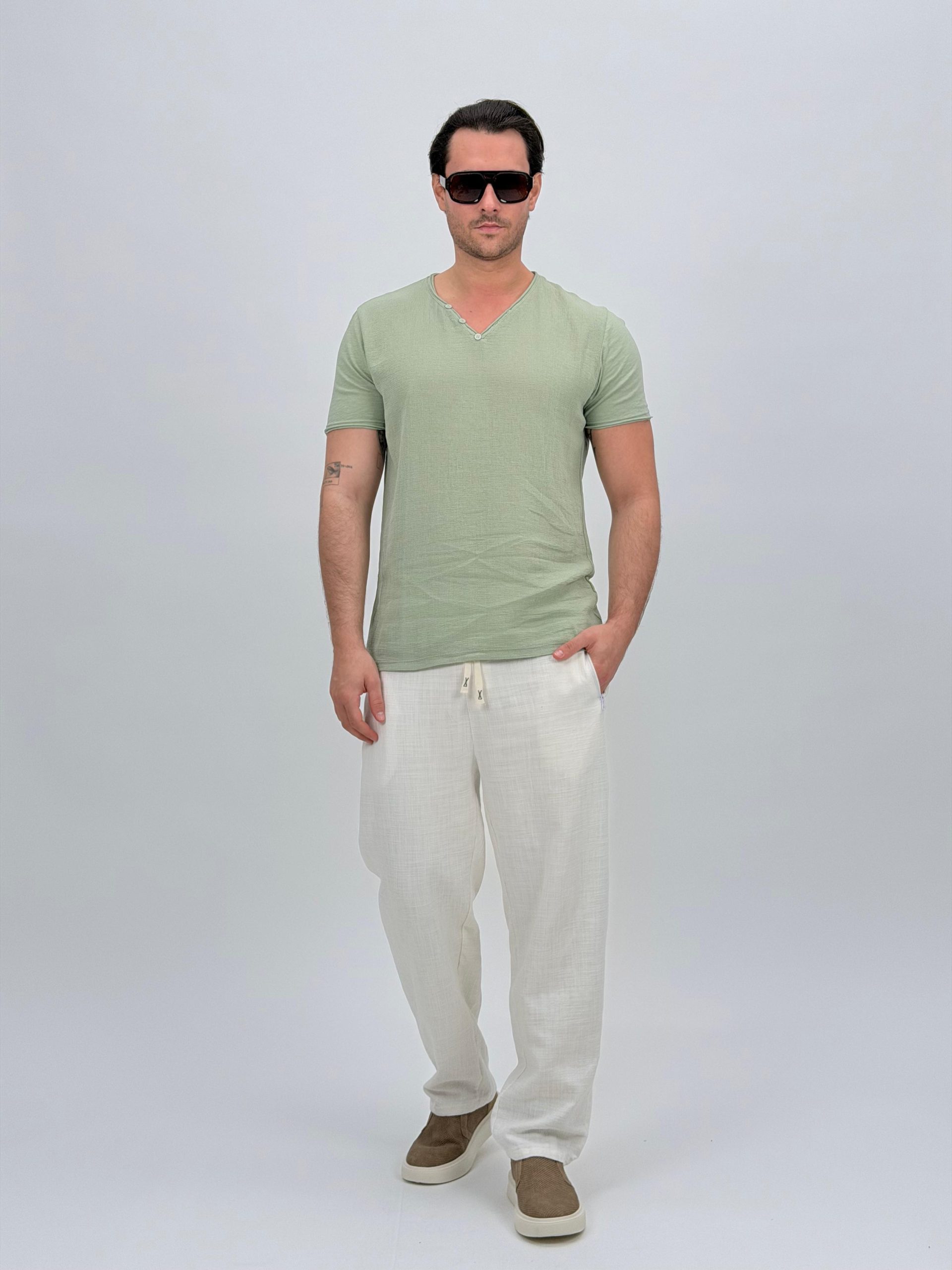 Tricou din in cu decolteu în V și nasturi