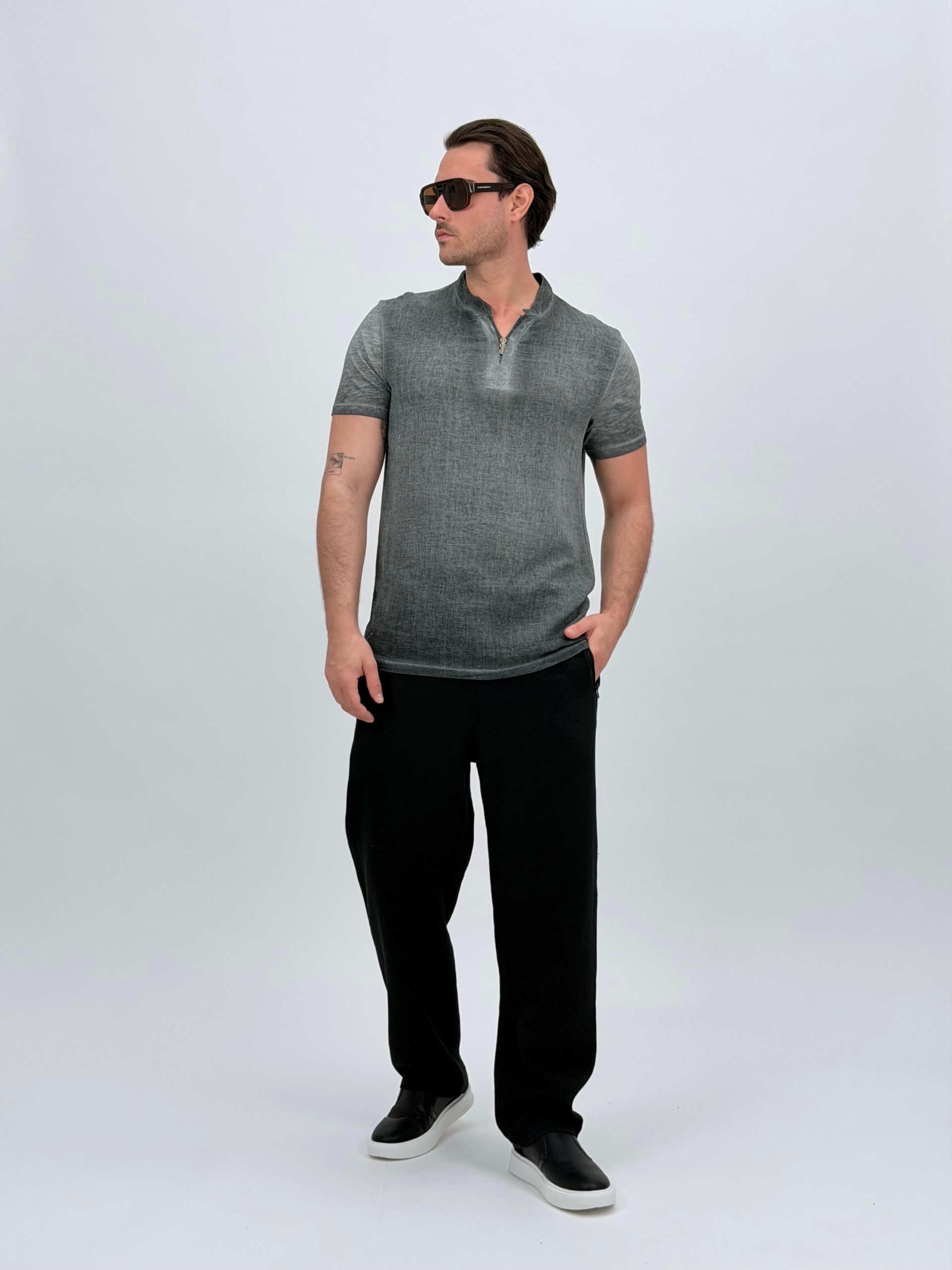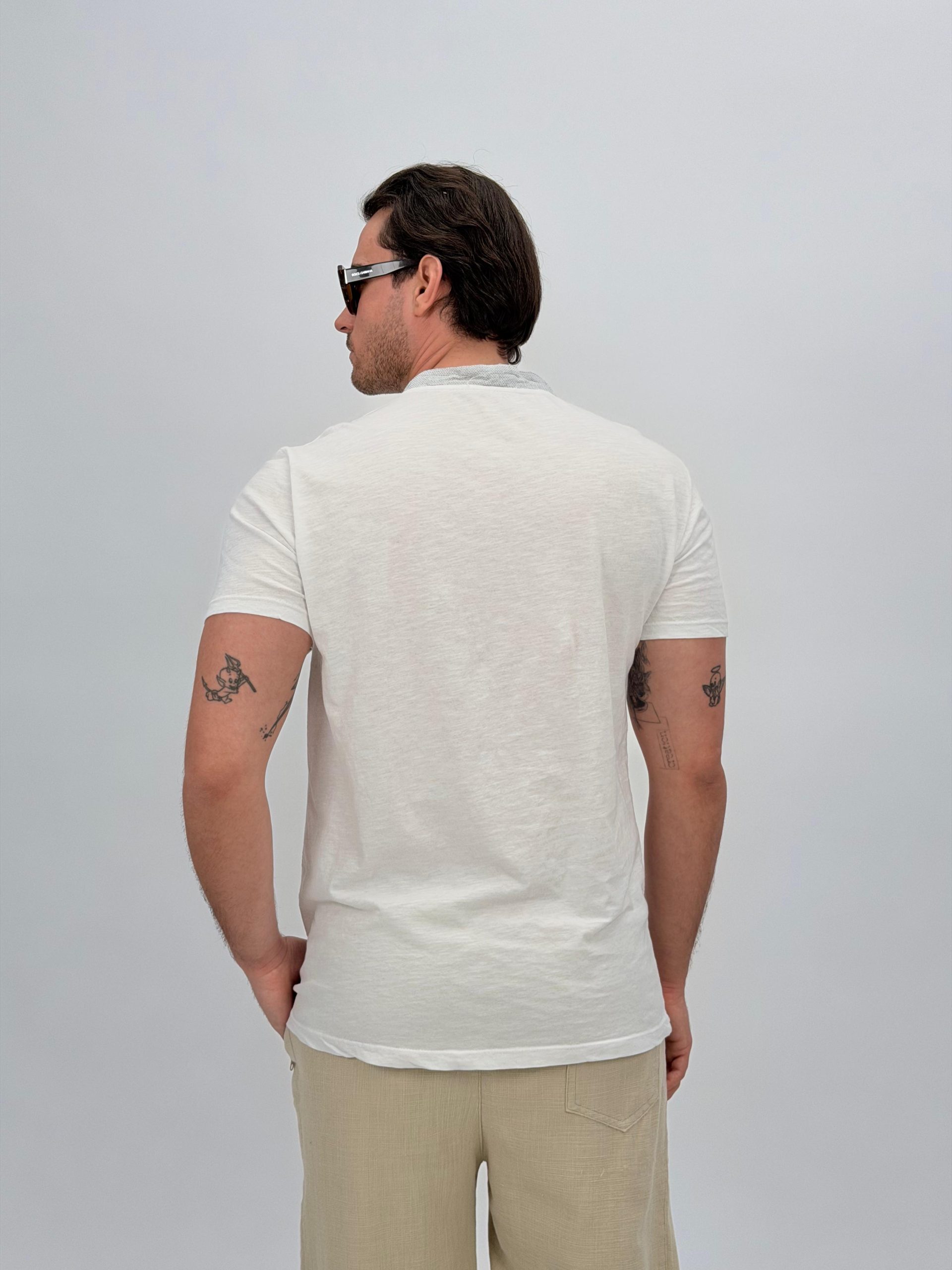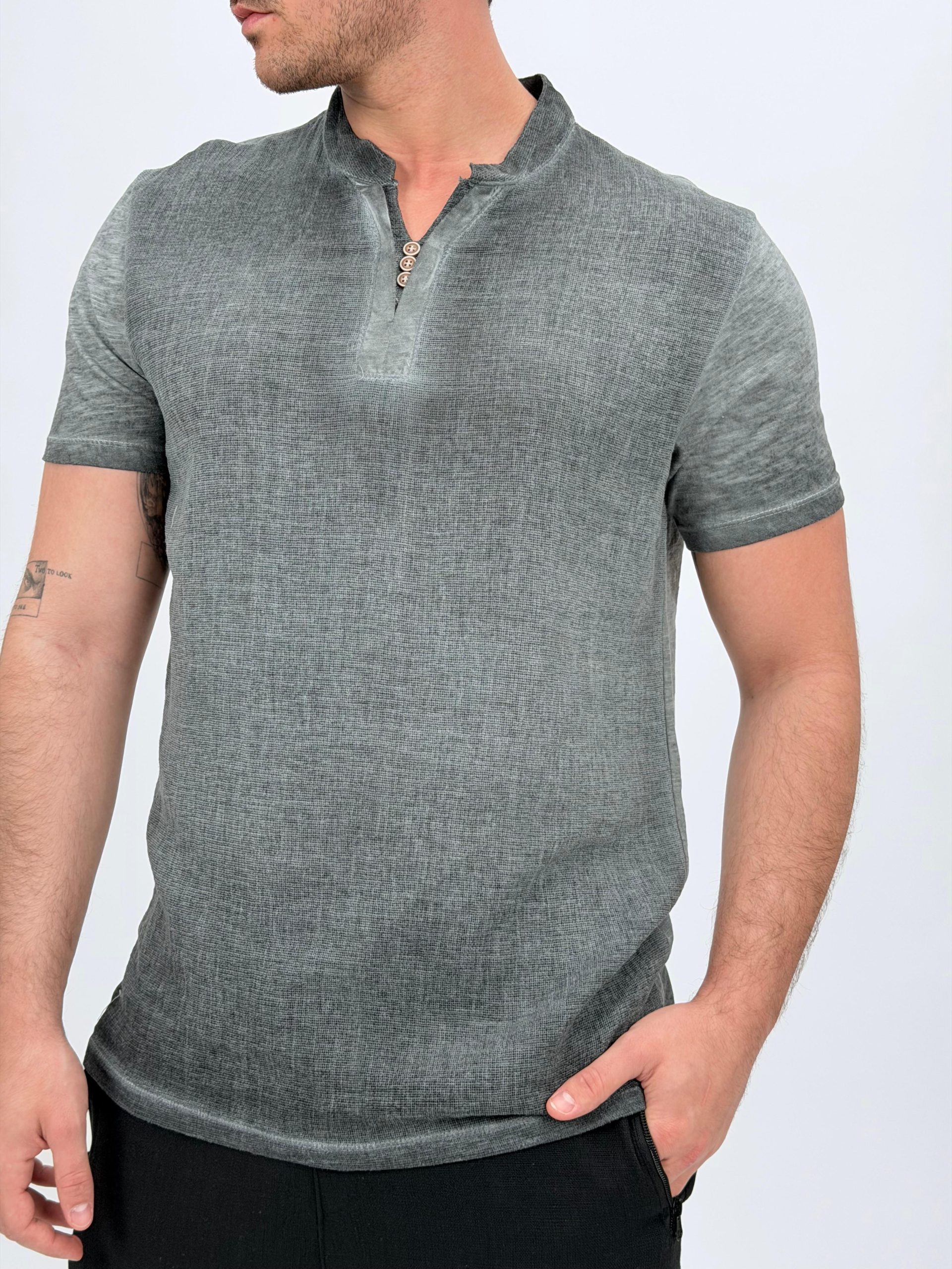 Tricou din in cu guler tunică și nasturi