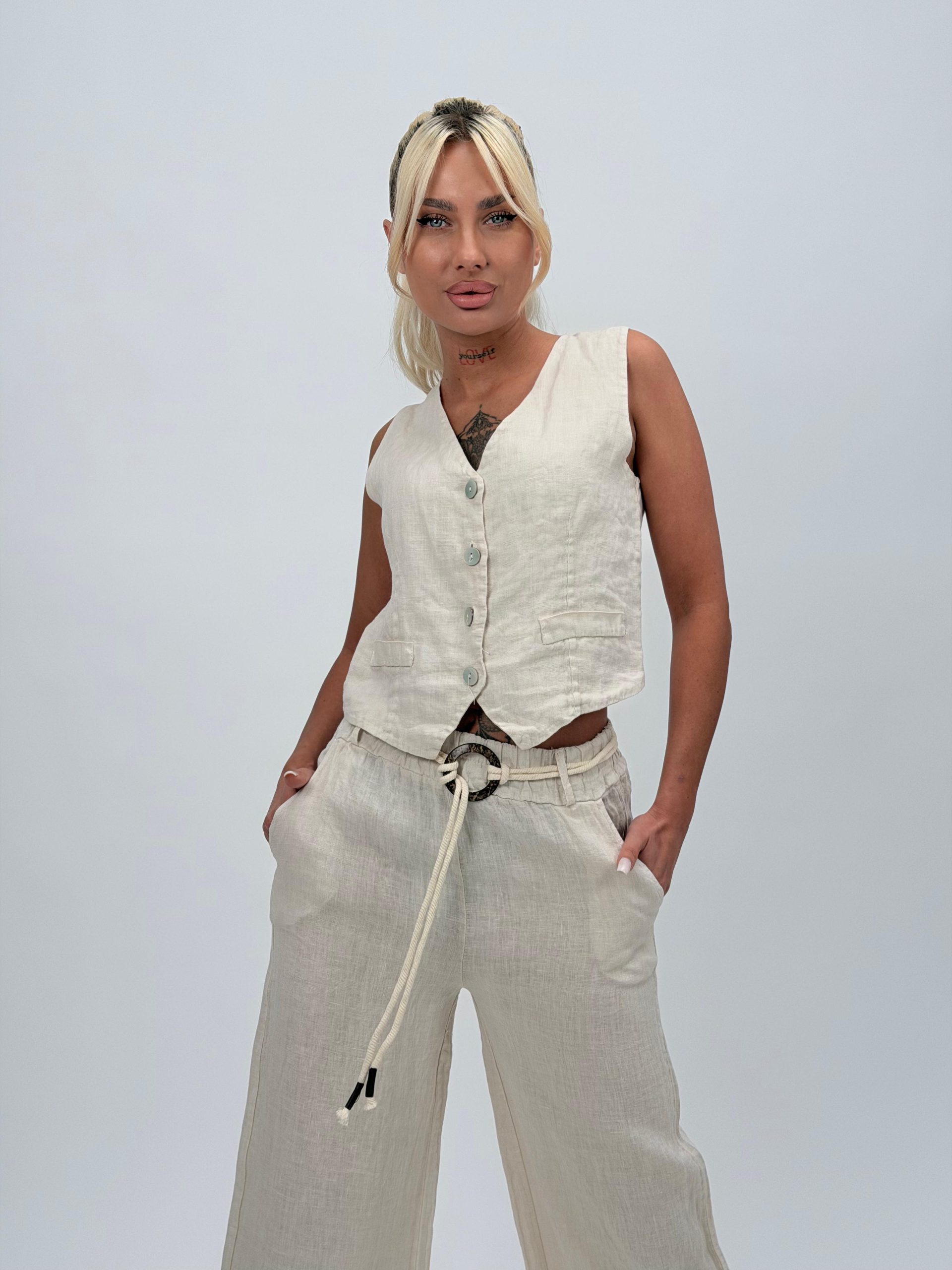 Această vestă din in este esențială pentru garderoba ta de vară, combinând stilul sofisticat cu confortul. Realizată din in de înaltă calitate, această vestă este perfectă pentru a adăuga un plus de eleganță și rafinament ținutelor tale estivale.